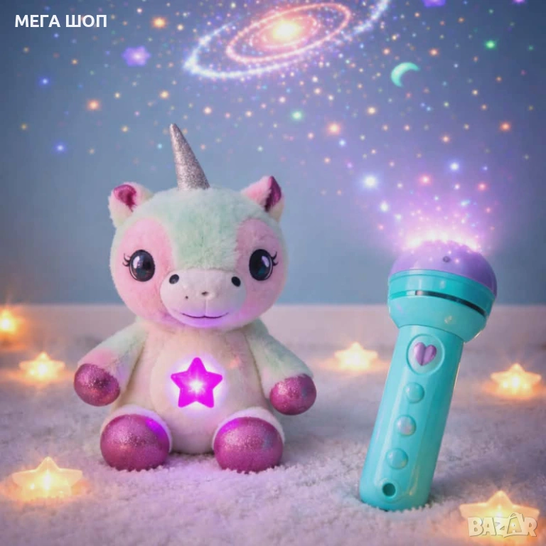 Плюшена играчка и проектор звездно небе еднорог с фенер;