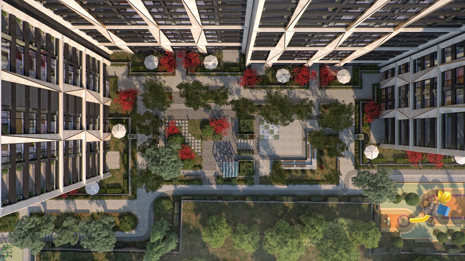 Комплексът предлага: 8 000 кв.м частен парк, детски площадки, спортно игрище и открит фитнес, алея за джогинг,ресторант, зони за отдих с фонтани и богато озеленяване, контрол на достъпа.