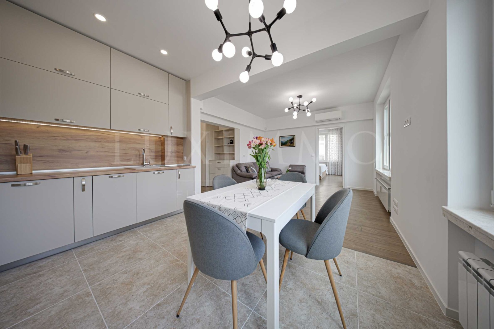 Жилището заема четвърти етаж от общо шестетажната сграда. Изложението е север и запад, с откриваща се панорамна гледка към забележителностите на града. Предлага се със стилен интериор със следните довършителни работи: