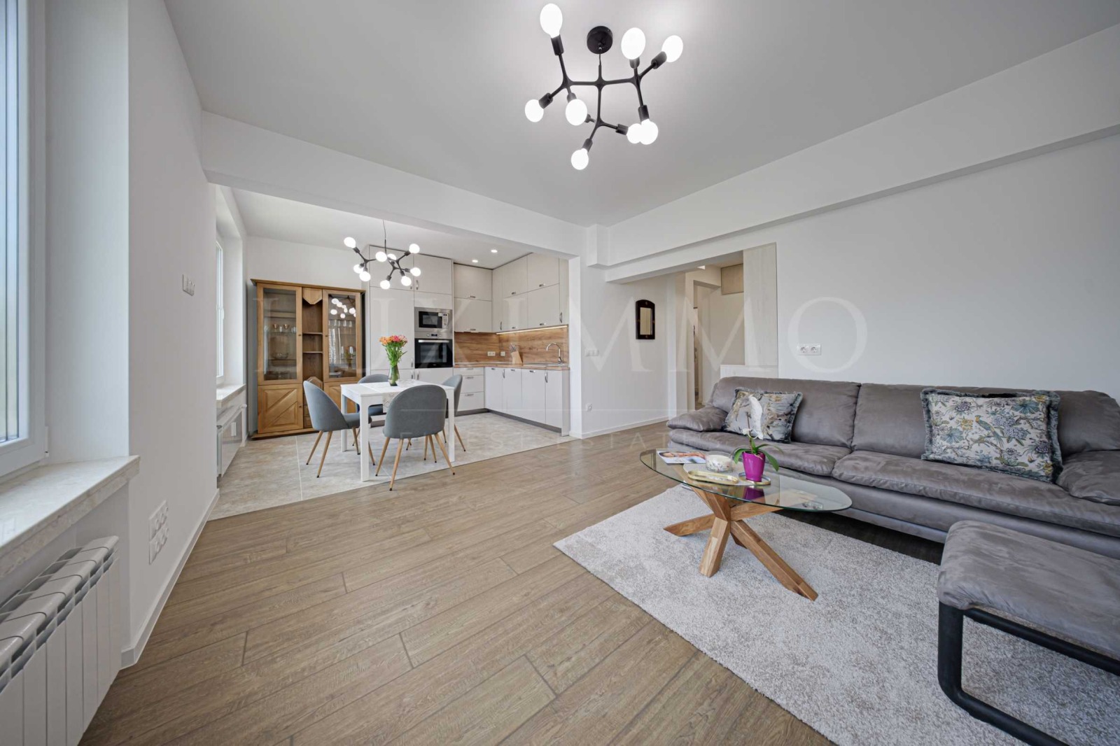 дневна с диван, холна маса, фотьойл, трапезарна маса с 4 стола, два бюфета и гардероб