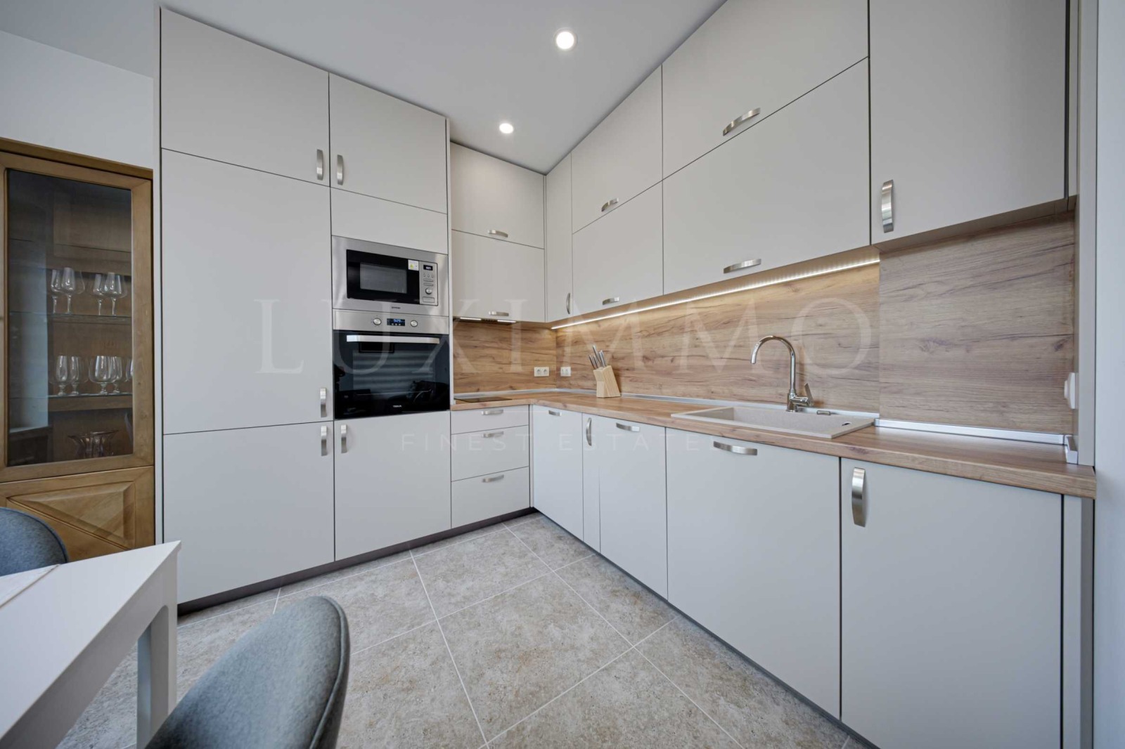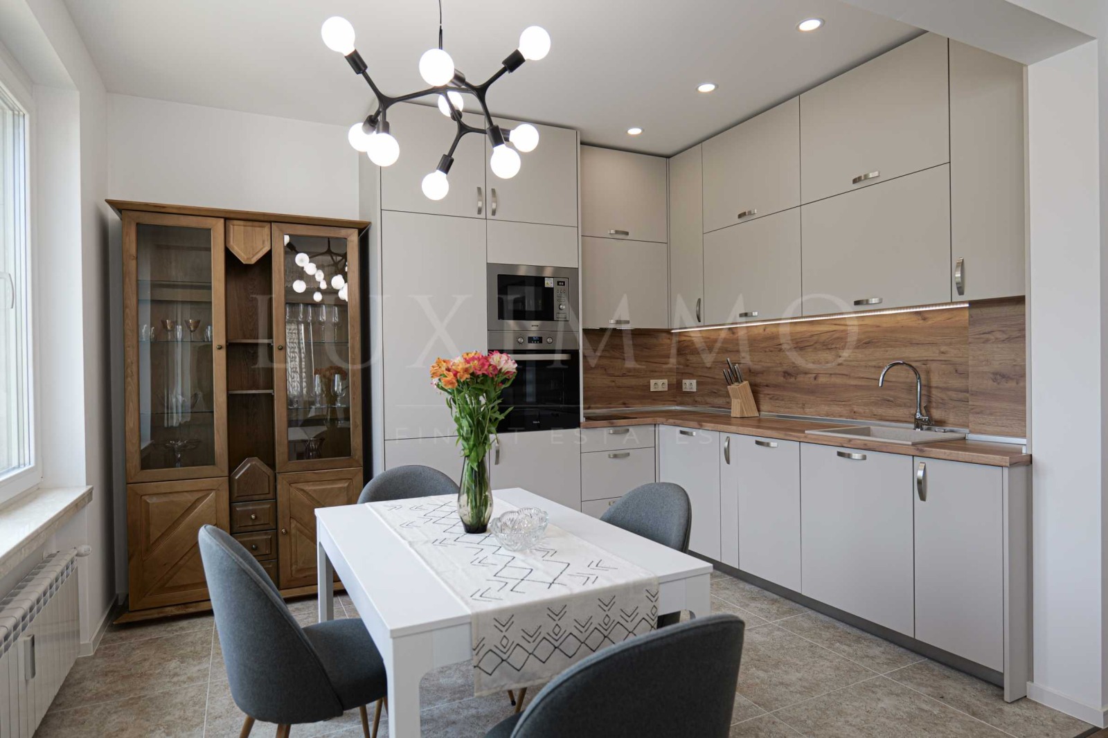 кухня с вградени ел. уреди: керамични котлони, фурна, аспиратор, хладилник с фризер, микровълнова, съдомиялна машина
