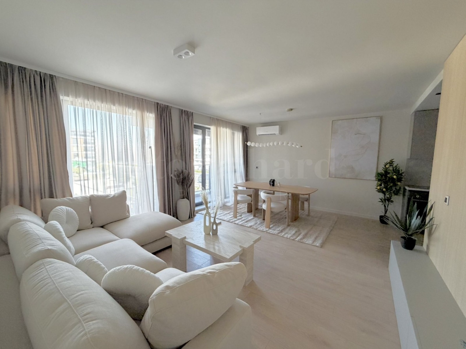 Апартаментът е изпълнен с внимание към всеки детайл, с висок клас довършителни работи, стилни мебели и модерни електроуреди. Интериорът е проектиран така, че да съчетава лукс, комфорт и функционалност.