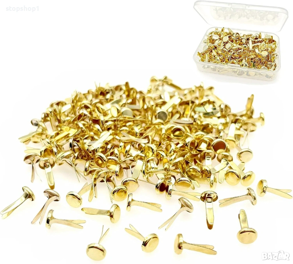- Златни метални брадчета за занаяти, идеални за закрепване на малки висулки или пергамент към картон. Идеални малки брадчета за занаятчийски проекти, като например изработка на картички, скрапбукинг, моделиране от хартия, пергамент и други занаяти.