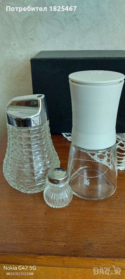 Продавам лот мелничка захарница и солничка WMF.Цена мелничка +захарница 20евро +подарък солничка.