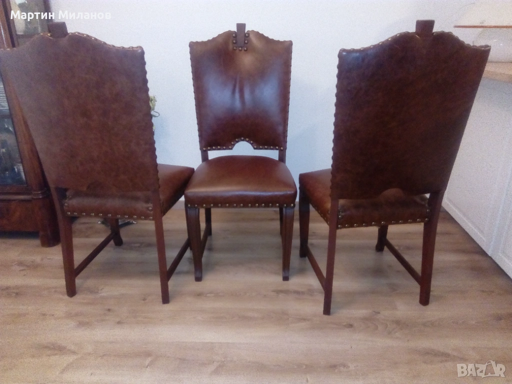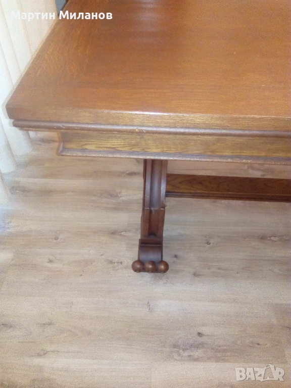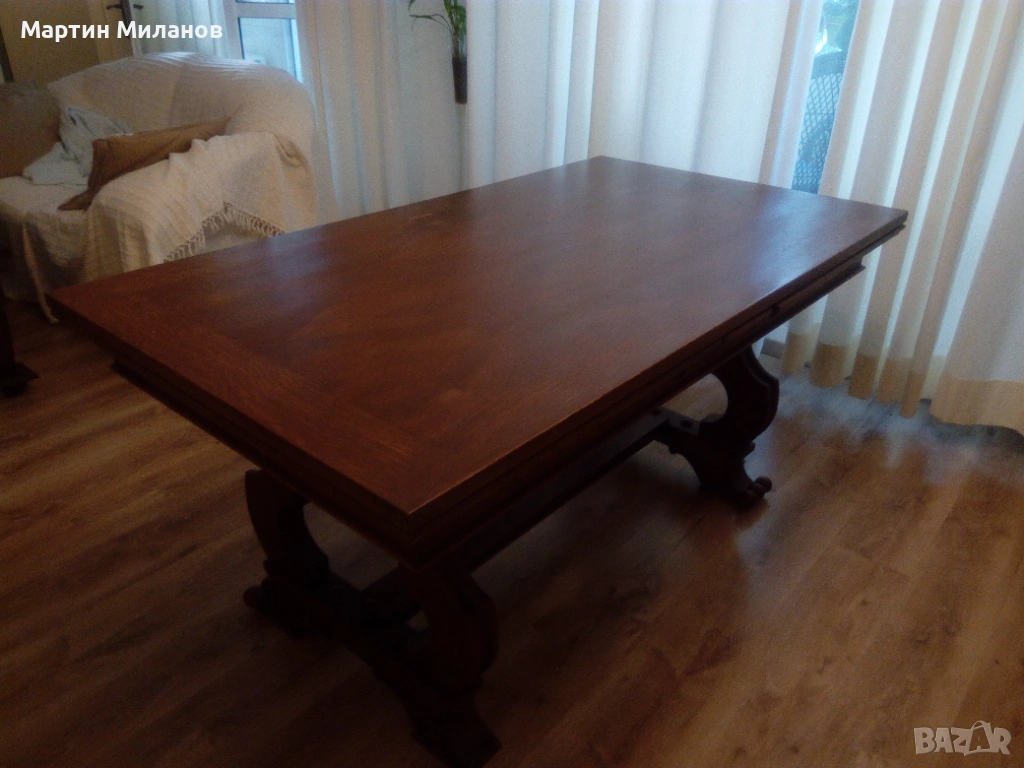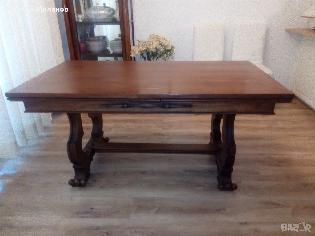 Антична маса с шест стола. Размери на масата:дължина 160 см,широчина 0,90 см, разтегателна е с две крила по 0,60 см. Шест стола претапицирани с италианска кожа.
