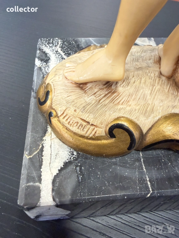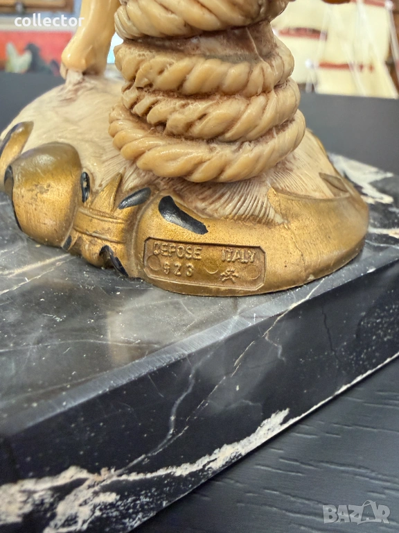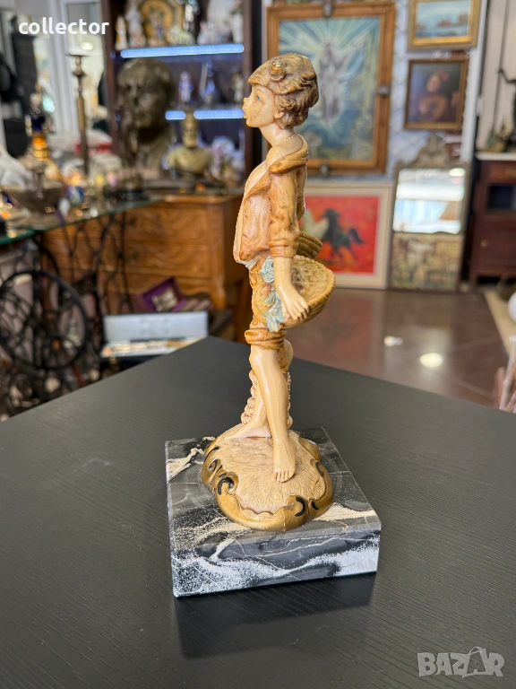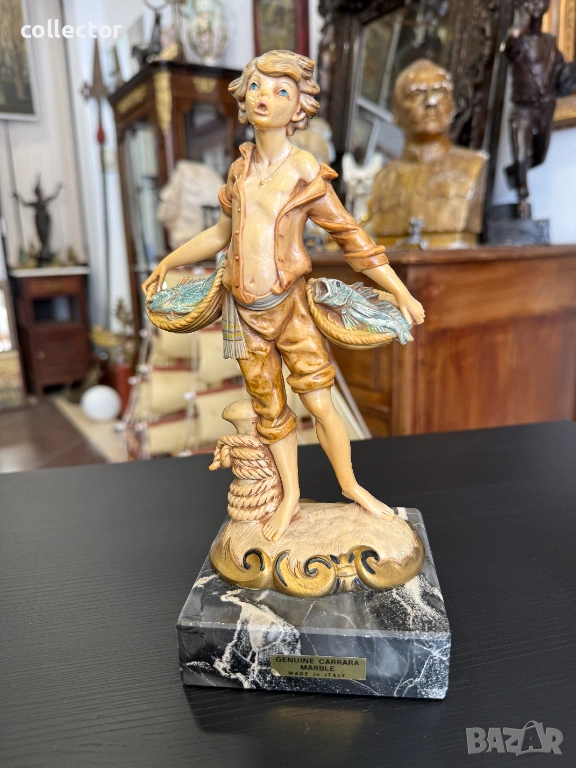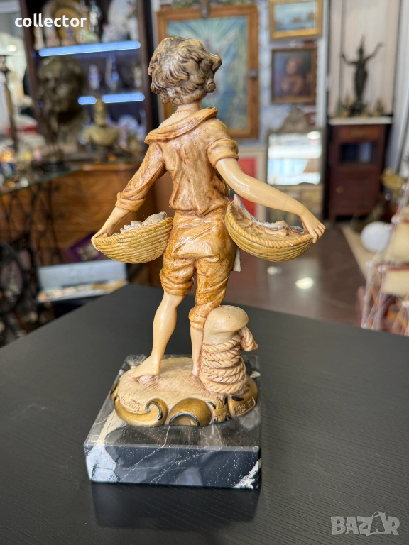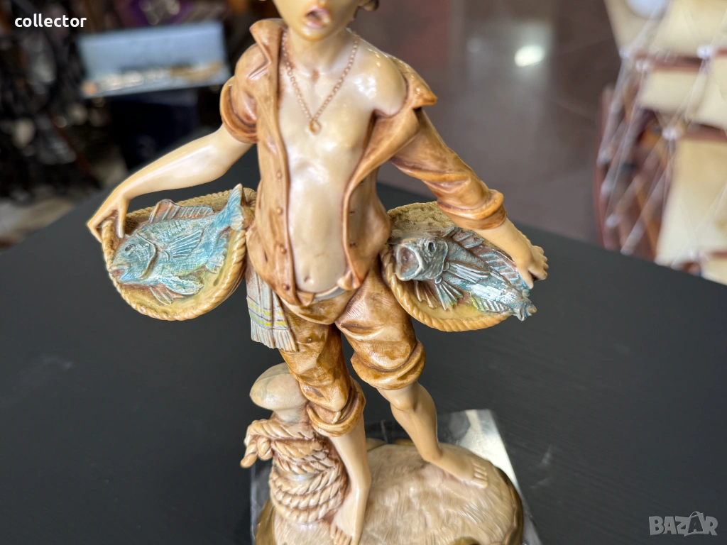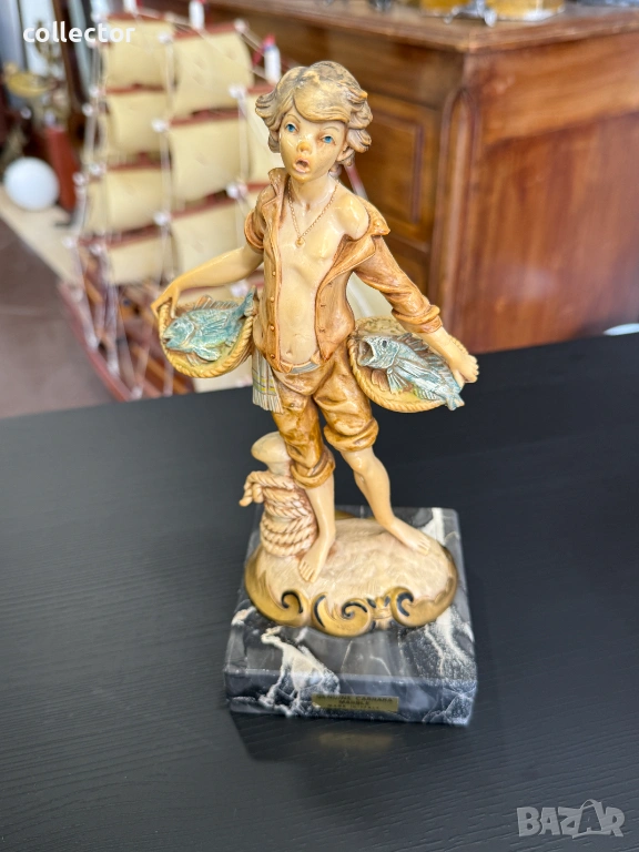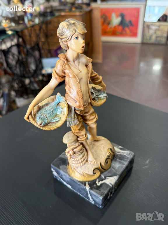 Статуетката изобразява младо момче, държащо две кошници, пълни с улов. Фигурата е част от популярна серия италиански декоративни предмети от средата на XX век. Изработена от италианският скулптор Amilcare Simonetti.