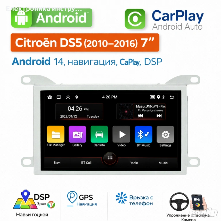 Мултимедия за Citroën DS5 (2010–2016) 7 – Android 14, навигация, CarPlay, DSP