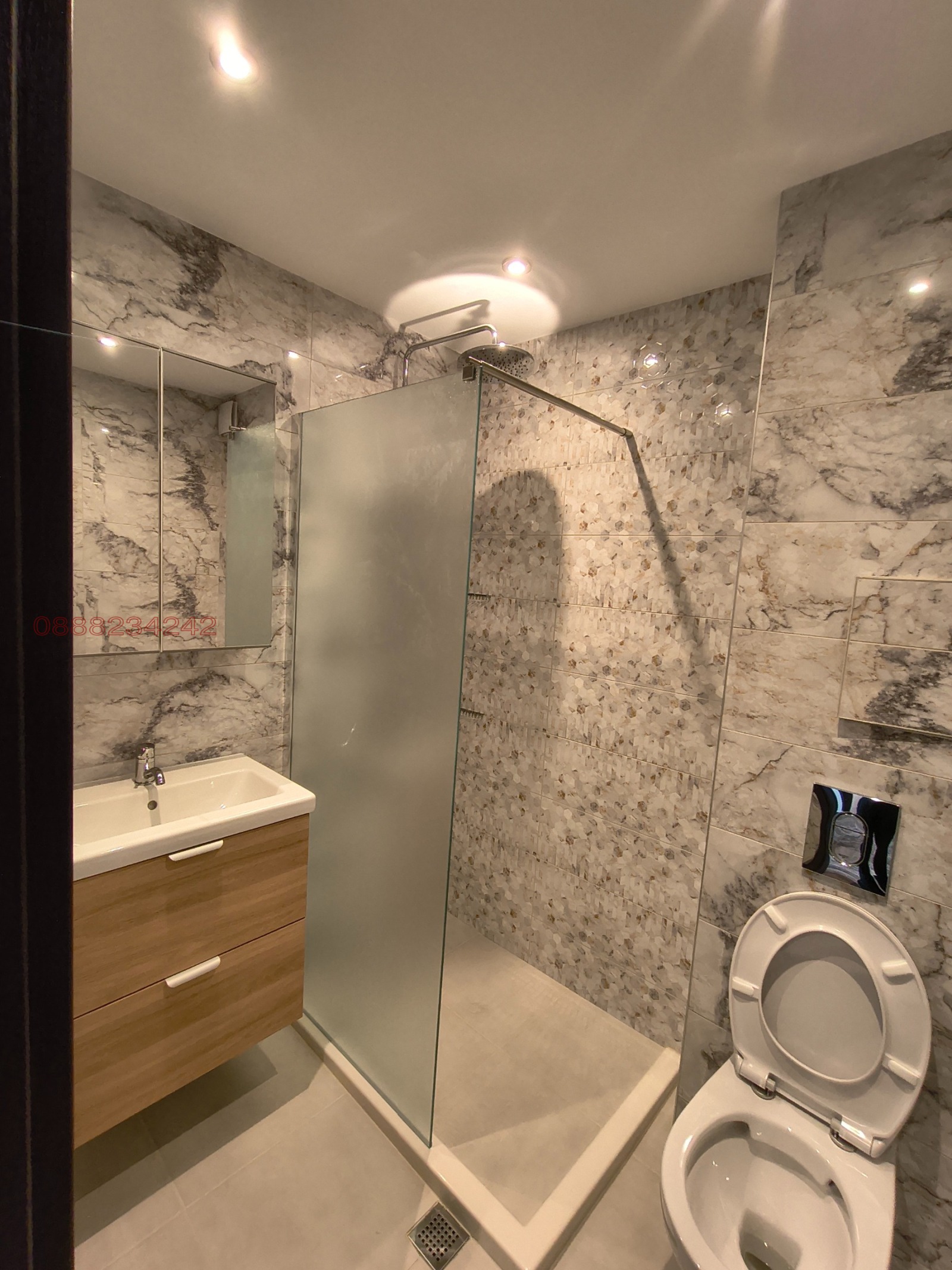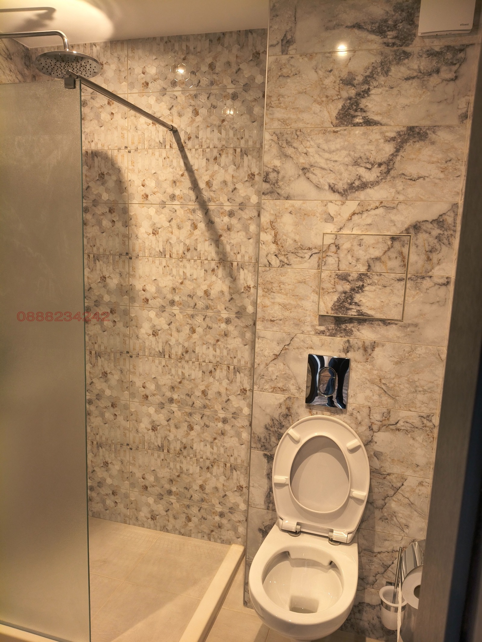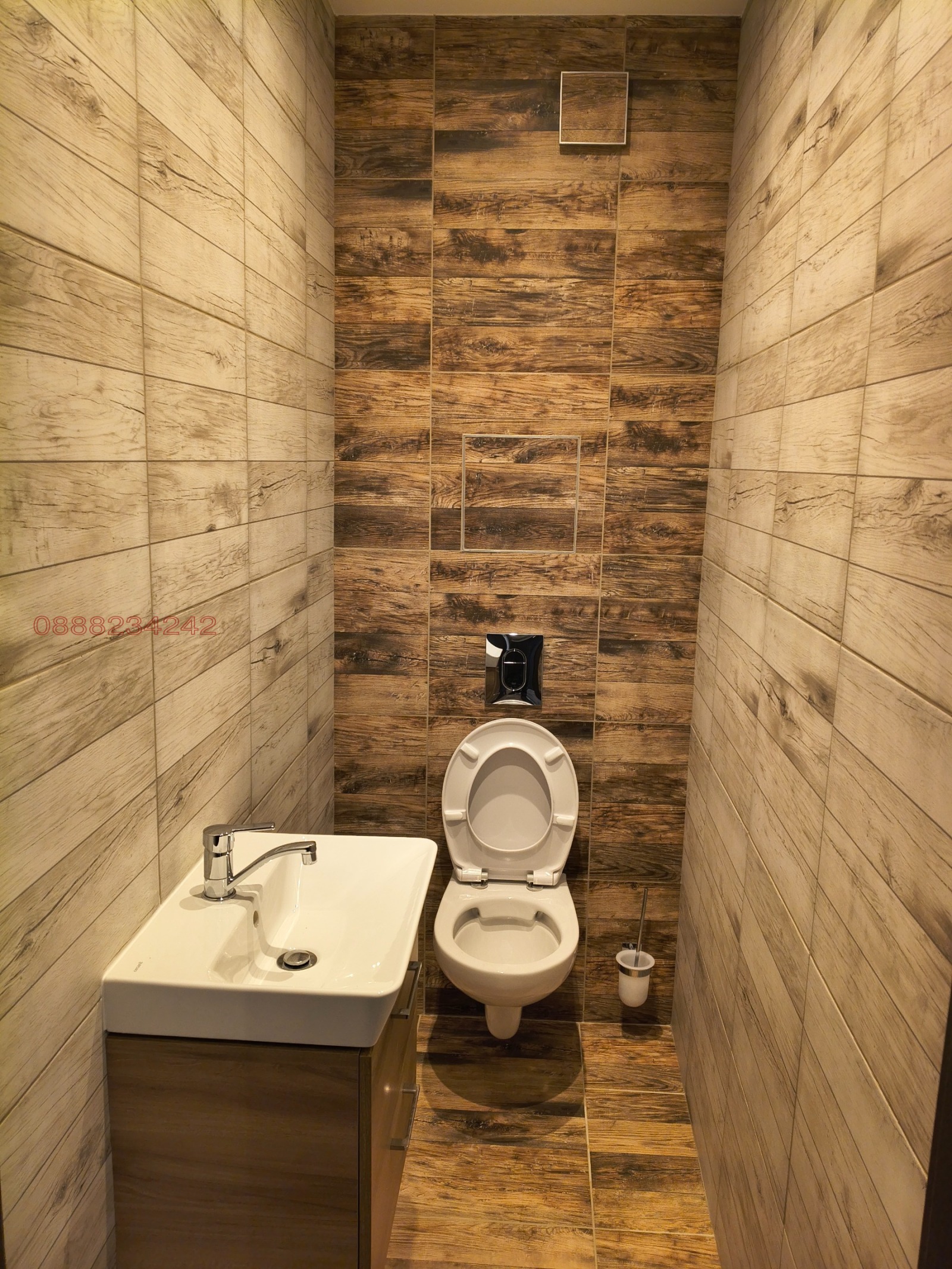 Банята е модерно завършена, с душ зона и качествена санитария, а отделната тоалетна осигурява допълнително удобство.