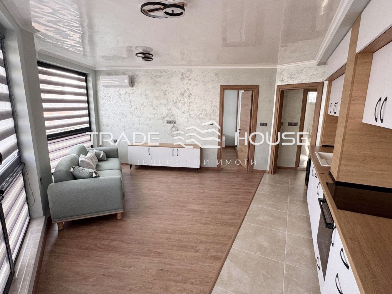 Антре, просторна дневна с кухненски бокс, две самостоятелни спални, баня с тоалетна и голяма панорамна тераса с излаз от хола и едната спалня, обхващаща двете помещения.