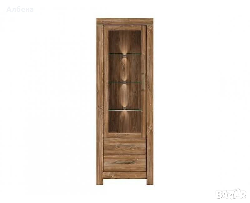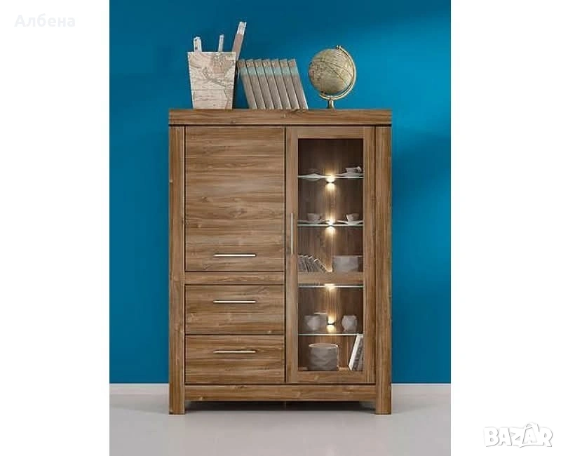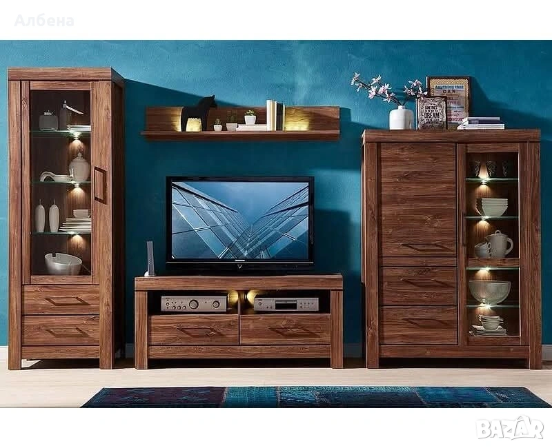Стилна и практична модулна секция, включваща витрини, ТВ шкаф и полица. Перфектно решение за дневна или хол, комбиниращо функционалност, елегантен дизайн и LED осветление.