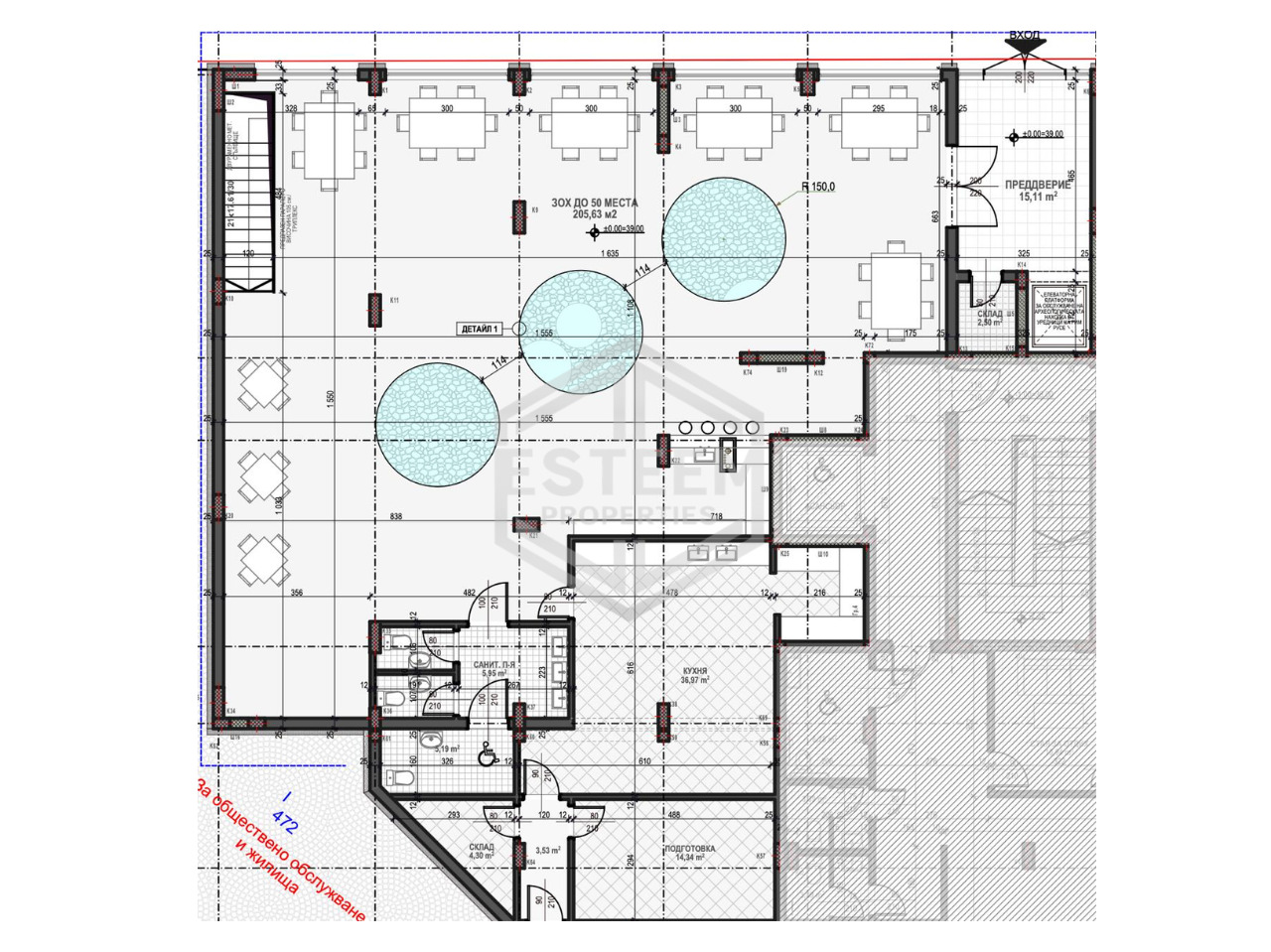 ➤ Кухненски блок: Професионална кухня с площ от 36.97 кв. м., допълнена от две зони за подготовка и складова база, гарантиращи гладко обслужване и висок кулинарен стандарт.
