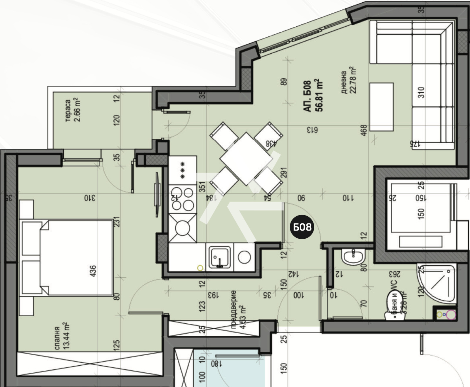 коридор, баня с тоалетна, дневна с кухненски бокс, спалня и балкон