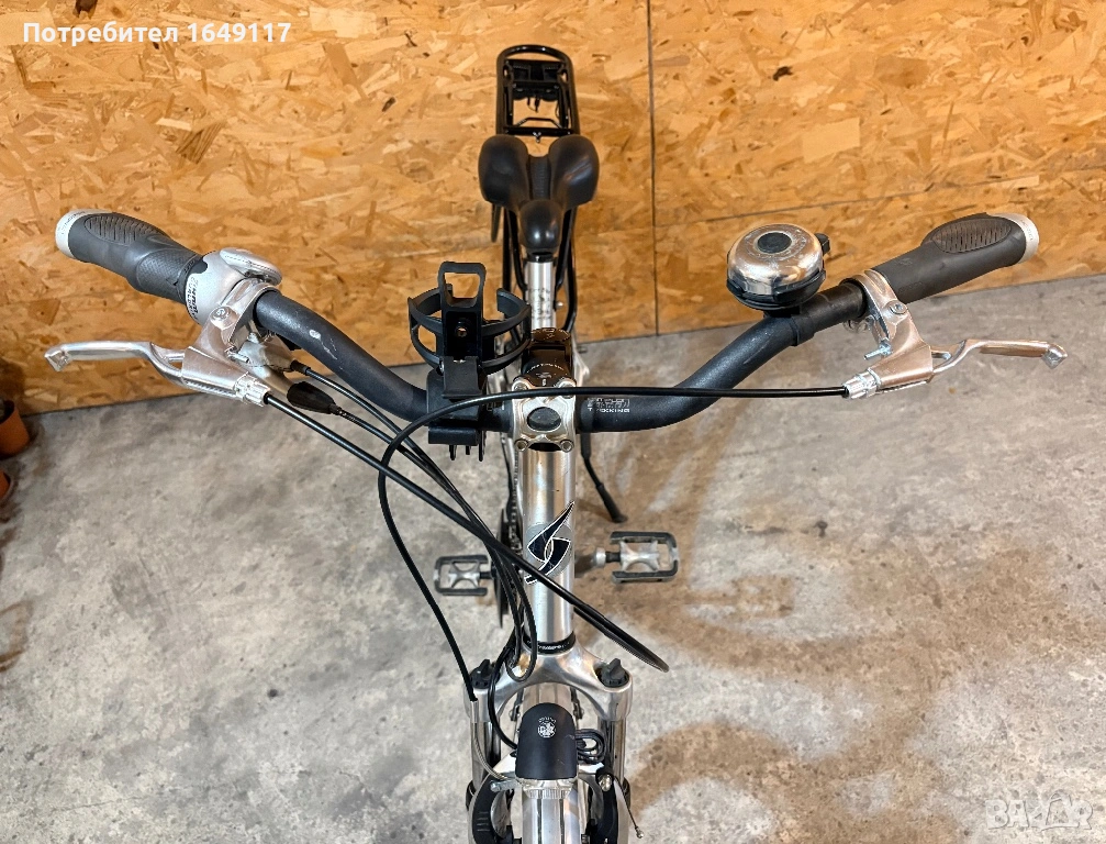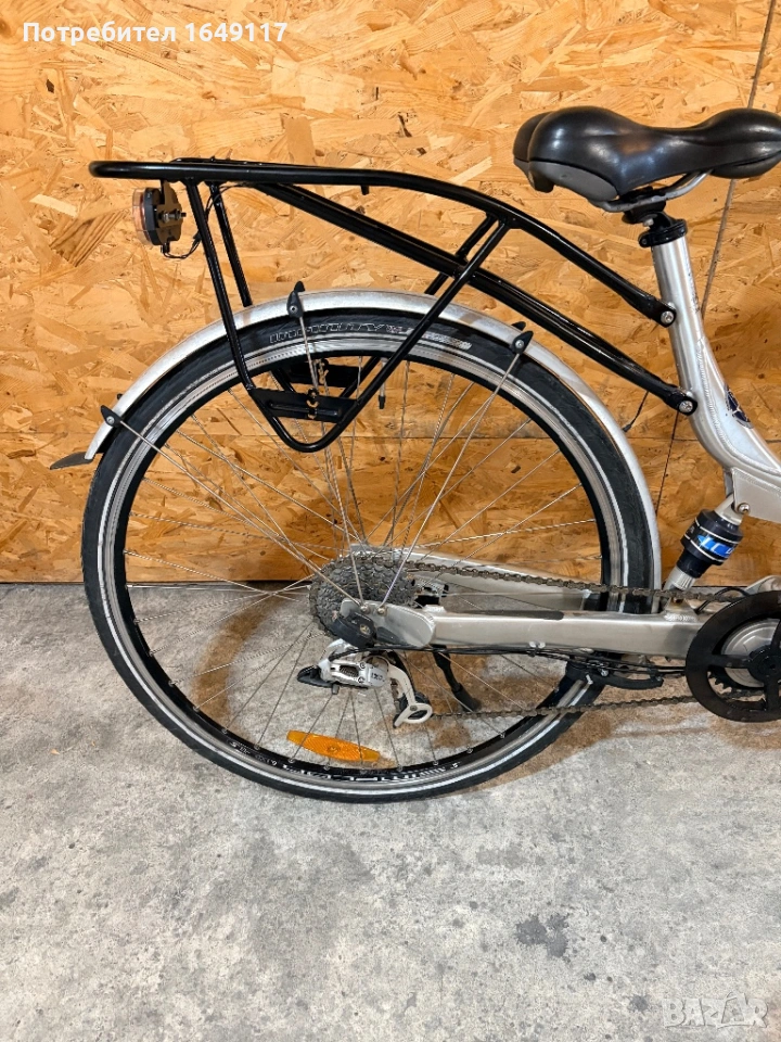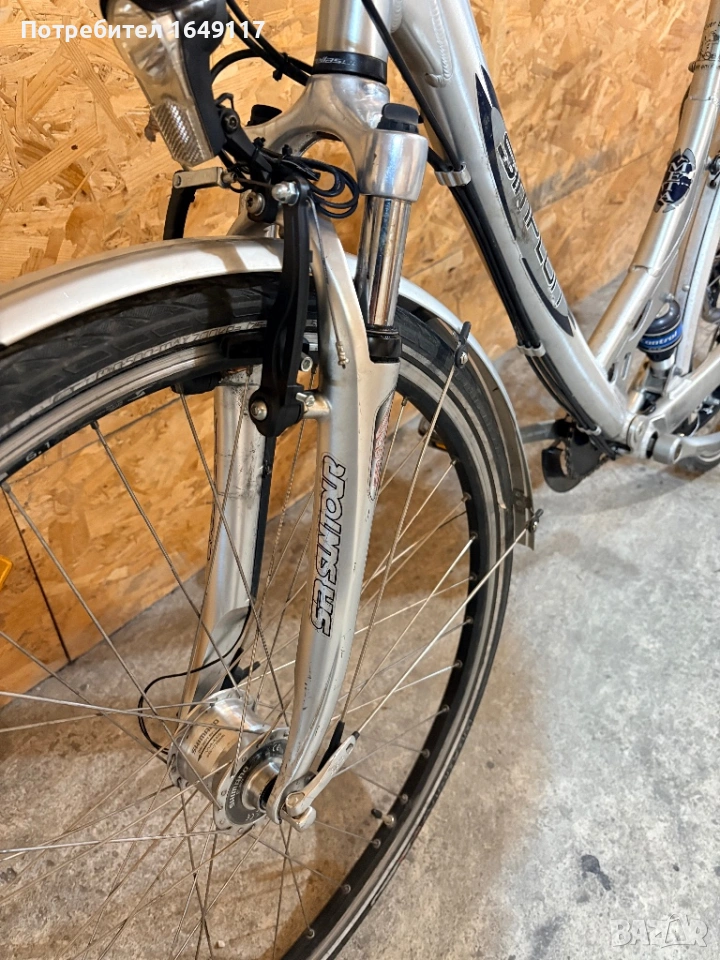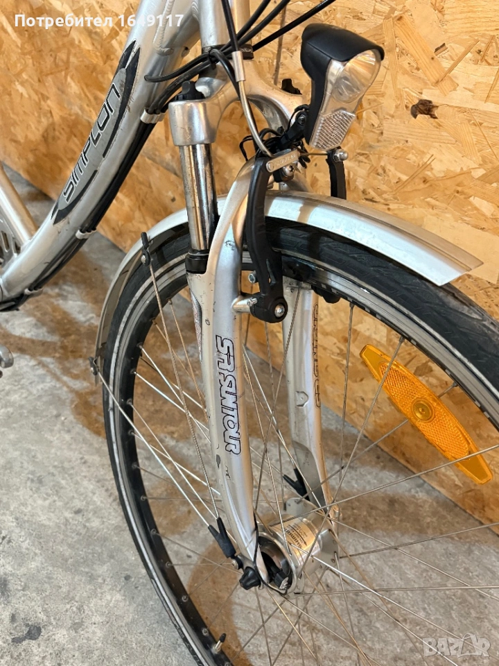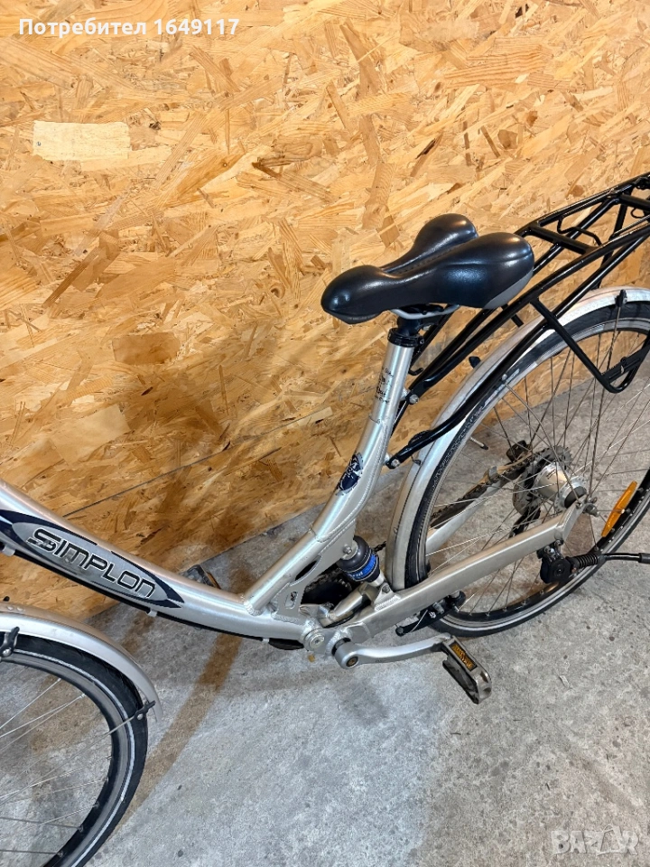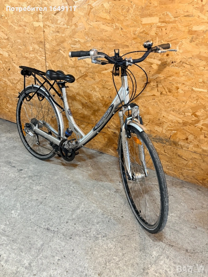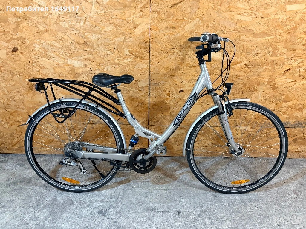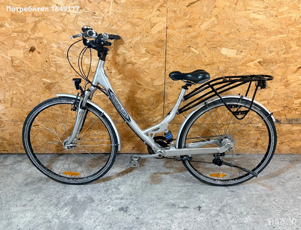 Продавам 28цола, малко употребяван, дамски-градски велосипед Simplon META [made in Germany]. Олекотена, алуминиева рамка [ALU7005] - 50см, с изправе стоеж и ниско прекрачване. Външни скорости SRAM Dualdrive - 27бр. c комбинирана revo shift/палцова командa SRAM. Предна алуминиева-амортисьорна вилка SR Suntour CR930. Централен амортисьор Suspa с регулиране на твърдостта. Алуминиеви курбели SRAM с алуминиеви педали. Спортна, гелова седалка Selle Royal с алуминиево колче. Алуминиеви капли Simplon[предна капла с динамо главина Shimano]. Гуми Infinity с усилен градски профил. Предна и задна алуминиеви V-break спирачки. Алуминиево кормило Simplon с алуминиева раздвижна лапа Simplon. Заден алуминиев багажник с натоварване до 15кг. Олекотени, пластмасови калници, стойка, диоден фар и диодна габаритна светлина, светлоотразители, звънец. Кошничка за бутилка.