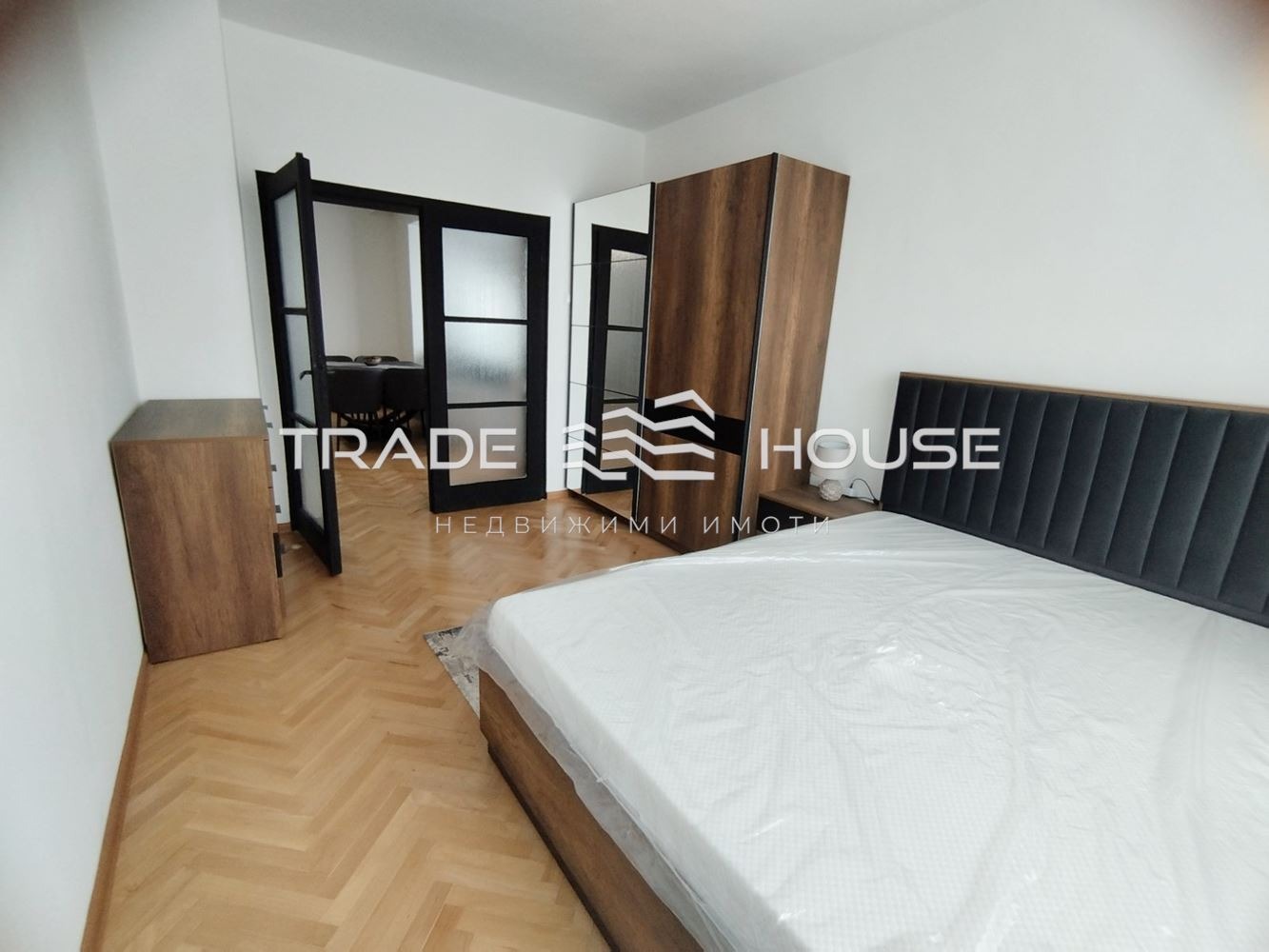 Спалня: Стилна и модерна, с голямо легло и гардероб с огледални врати, осигуряващи допълнителна светлина и усещане за простор.