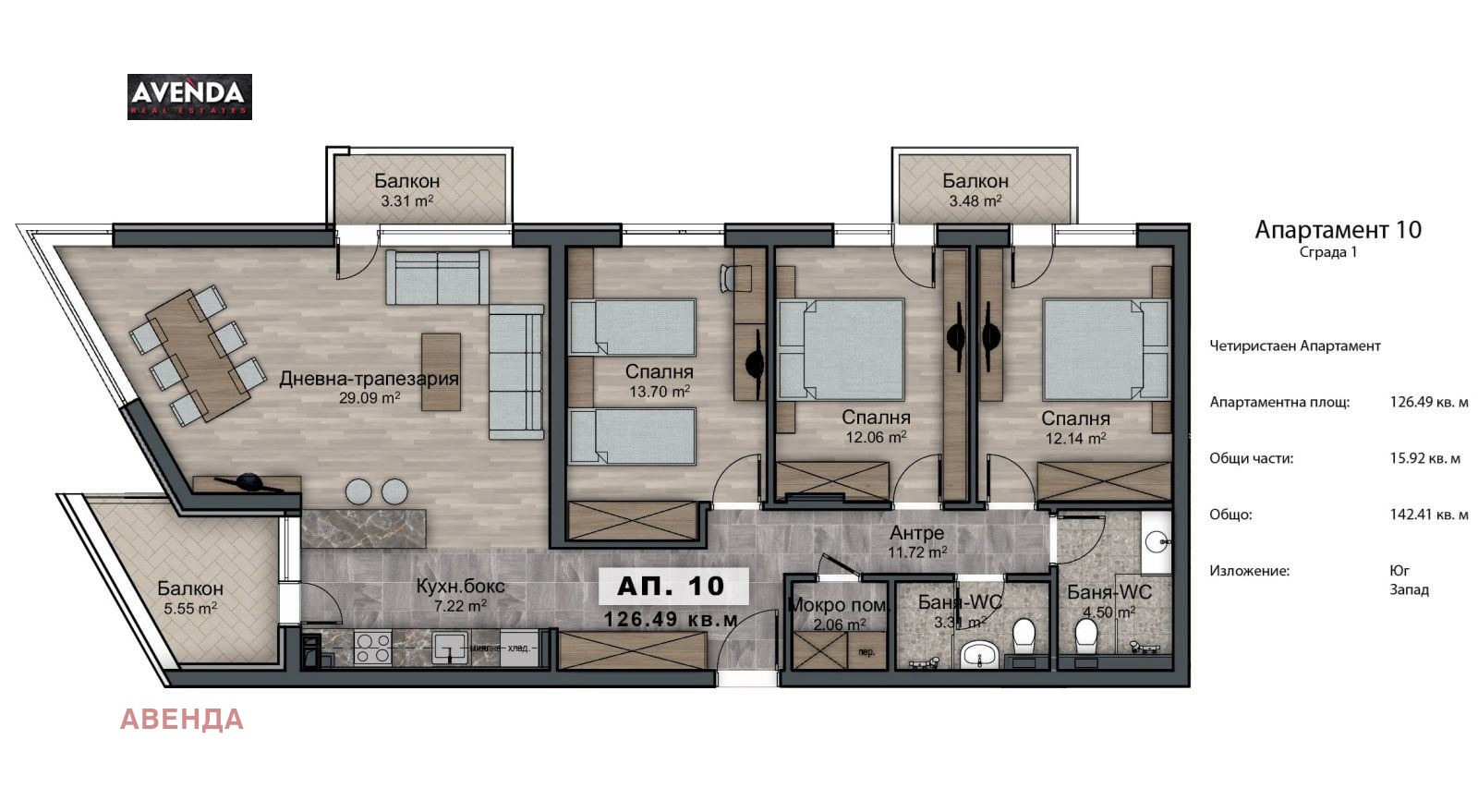Квадратура: Застроена площ - 142,41 кв.м., с общи площи - 126,49 кв.м.