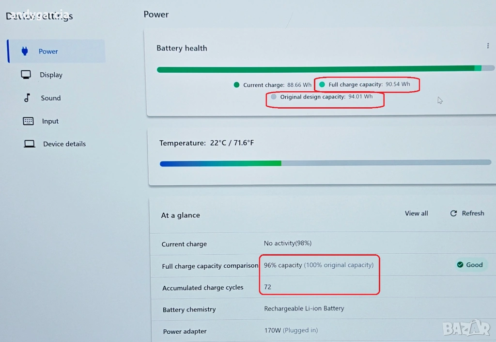 - батерия в много добро здраве, на 96% от капацитета си 90.54Wh от фабричните 94Wh, реален живот до 3:00-4:00 часа и повече зависимост от натоварването.