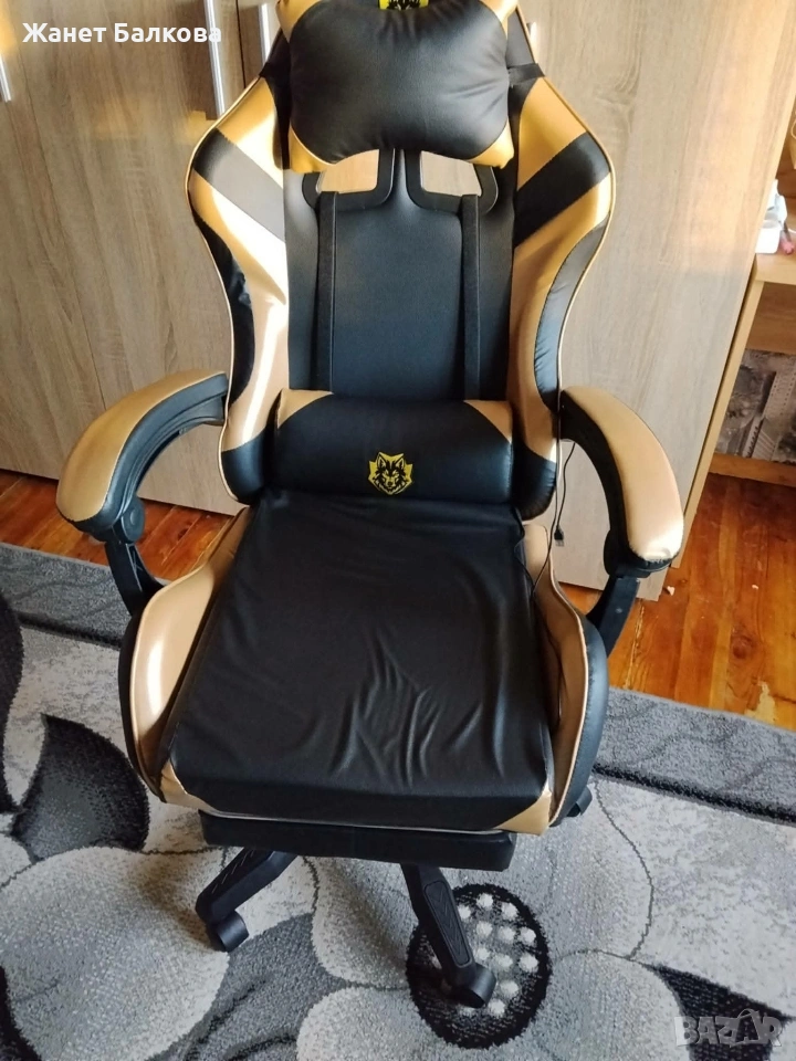 Геймърски стол с масажна функция, лумбална възглавница и поставка за крака – Черен-златист → Обява 53874394