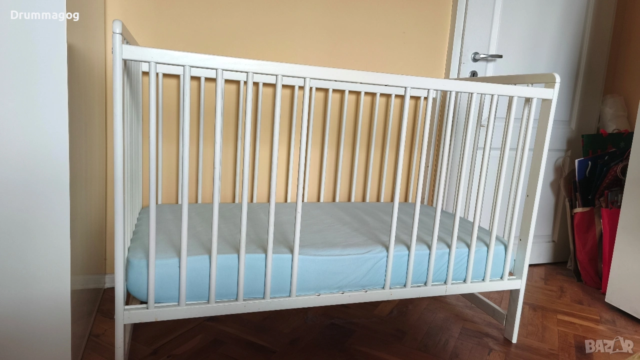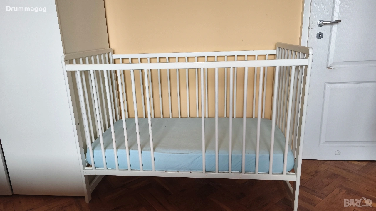 Детско / бебешко легло, изработено от масивно буково дърво в бял цвят.