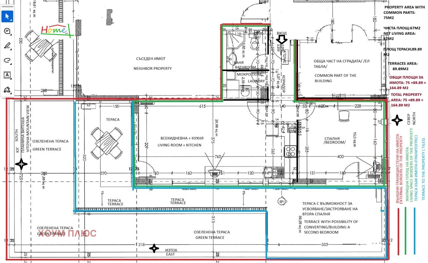 📐 Имотът е с обща площ от 164.91 кв.м., от които 75.02 кв.м. апартамент и впечатляваща тераса от 89.89 кв.м. Разпределението включва антре, просторен хол с кухненски бокс, спалня, баня с тоалетна, мокро помещение и просторни тераси. Изложението е предимно южно, като големите прозорци осигуряват изобилие от естествена светлина и разкриват красива гледка към Витоша. Има възможност за изграждане и обособяване на втора спалня.