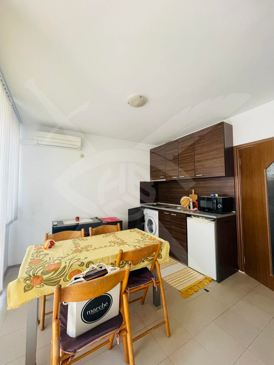 РАЗПРЕДЕЛЕНИЕ: Жилището разполага с площ от 62 кв.м., разпределена във входно антре, дневен тракт с кухненски бокс, спалня, две тераси, баня и тоалетна.