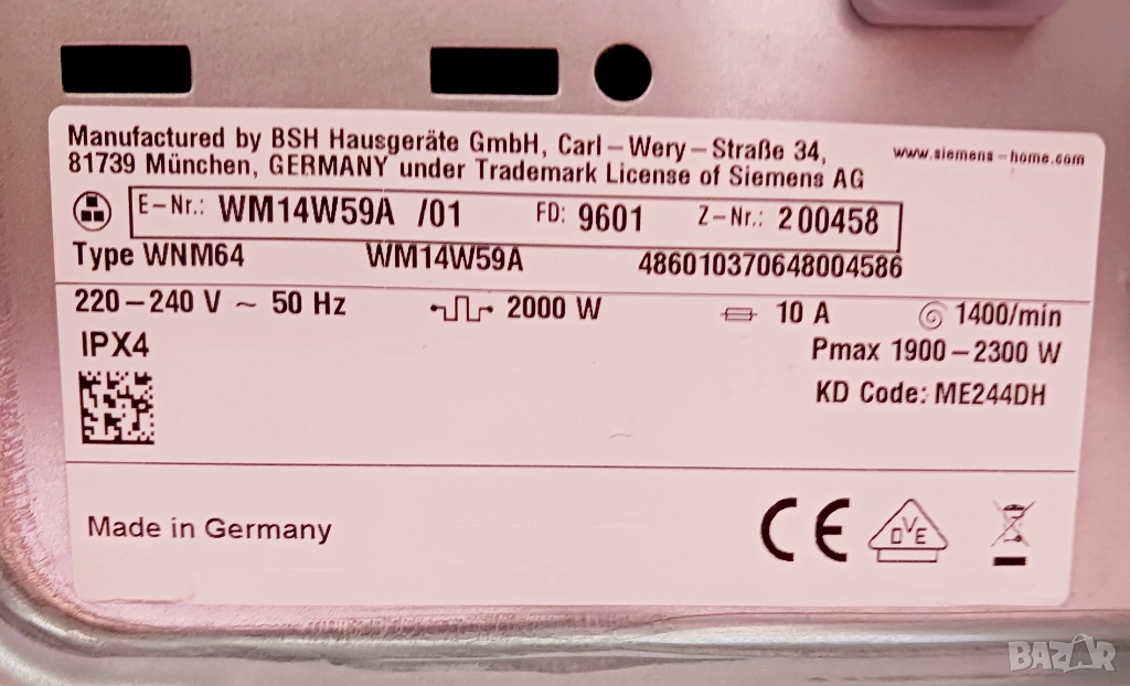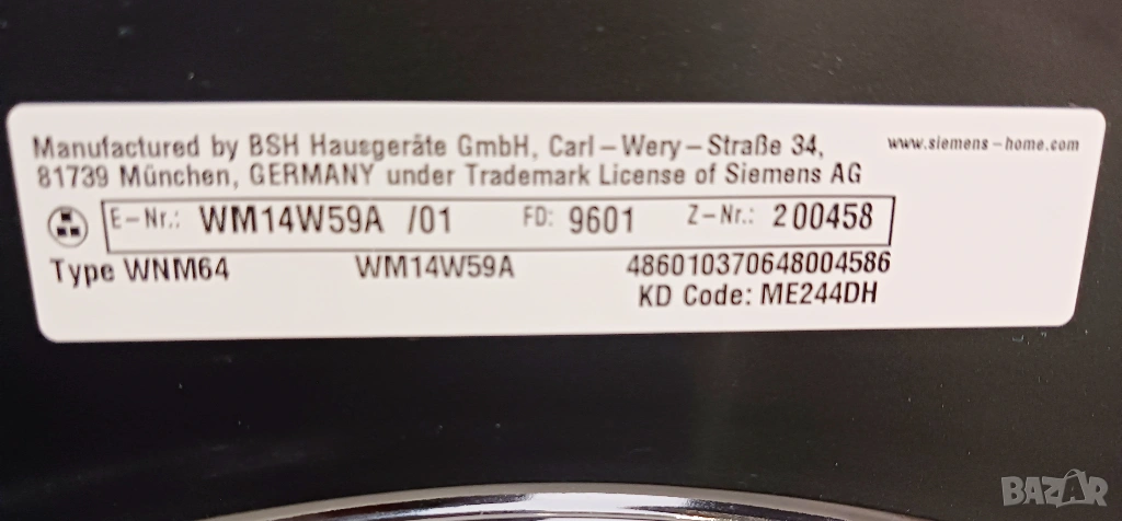 Пералня SIEMENS WM14W59A, произведена в Германия.