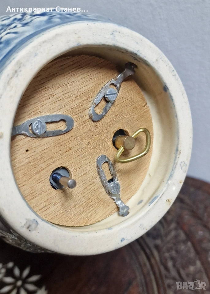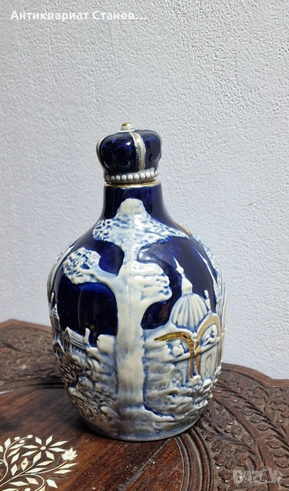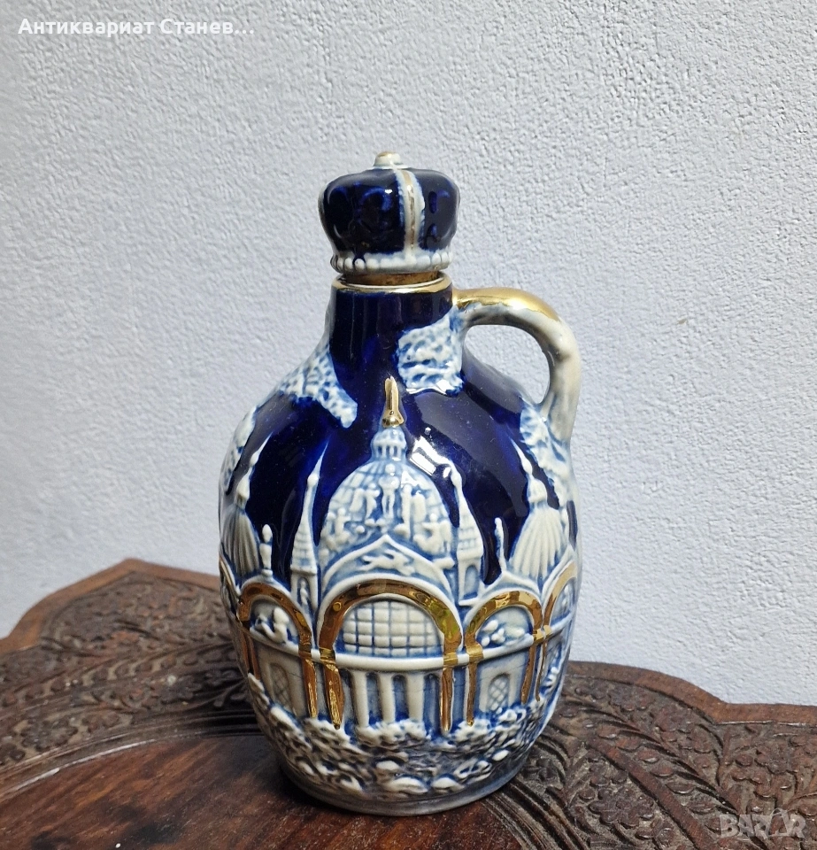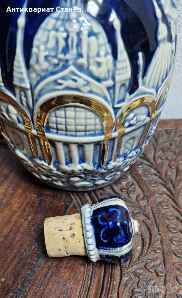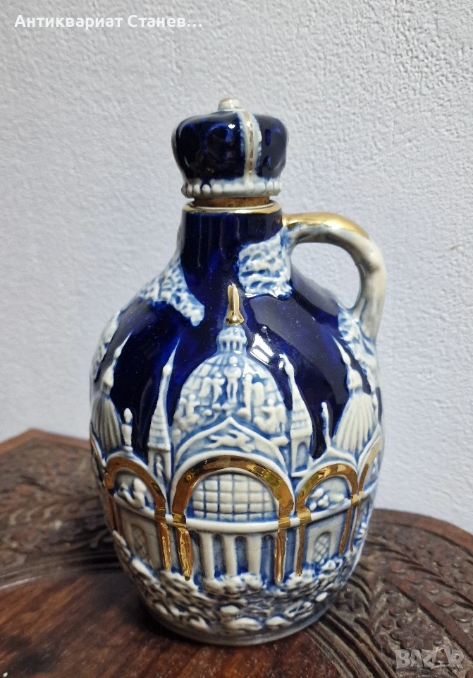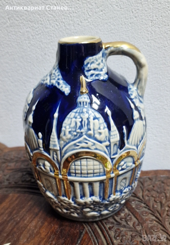 ✨ Красива музикална керамична бутилка с богата релефна декорация и кобалтово синьо остъкление. Детайлният архитектурен мотив с куполи и арки е подчертан с фини златисти акценти, които придават на предмета елегантно винтидж излъчване.