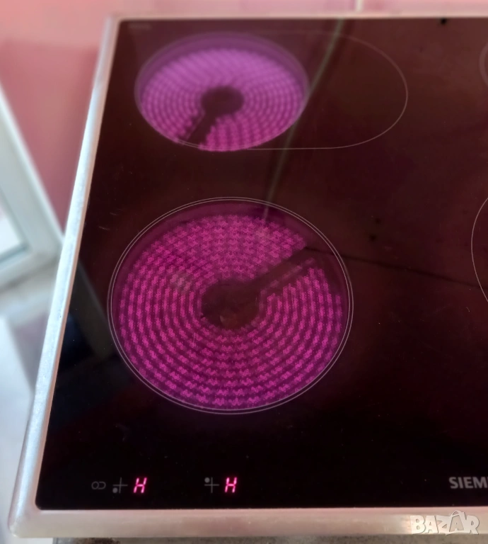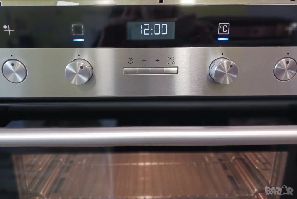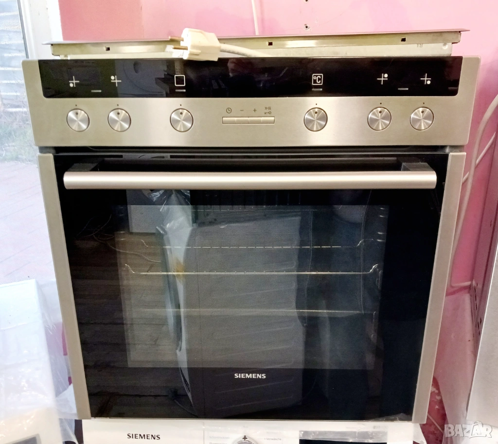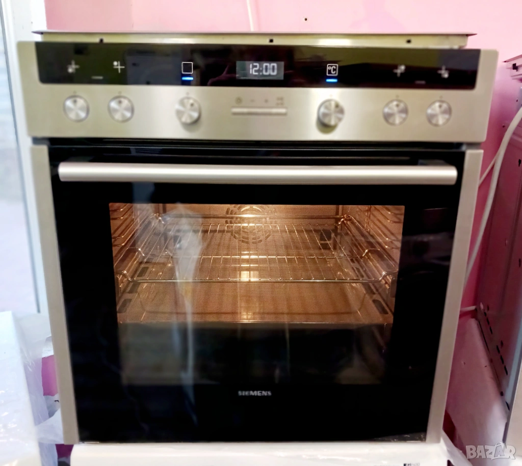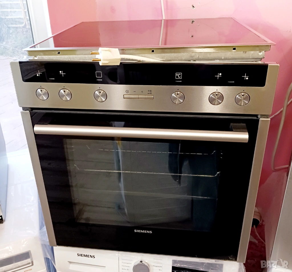 Печка за вграждане SIEMENS, произведена в Германия / цвят - инокс / с пуш бутони и LCD дисплей с часовник, таймер, заключване и др./ Фурната е с вратичка тип студено стъкло, с телескопични водачи и каталитично почистване на задния панел. Има 9 функции (грил, вентилатор, конвекция, размразяване и др.) / котлоните са с 9 степени / плота е с 4 котлона, 2 разширения (сензорни), индикатори за остатъчна топлина и метален кант.