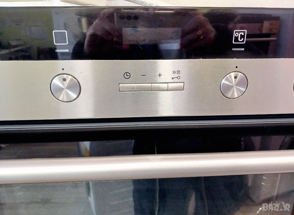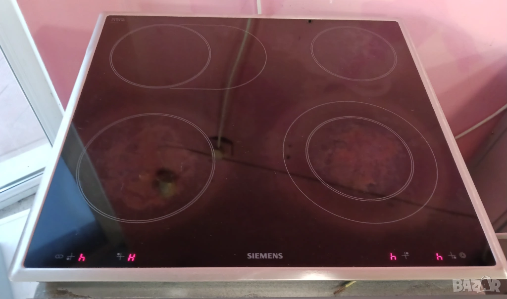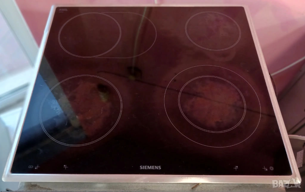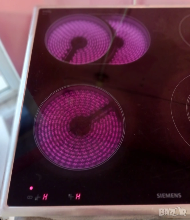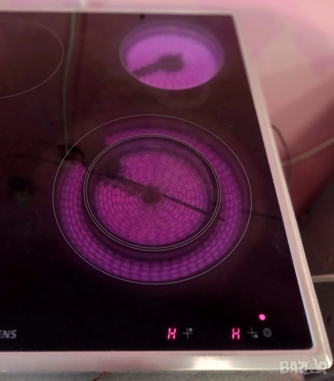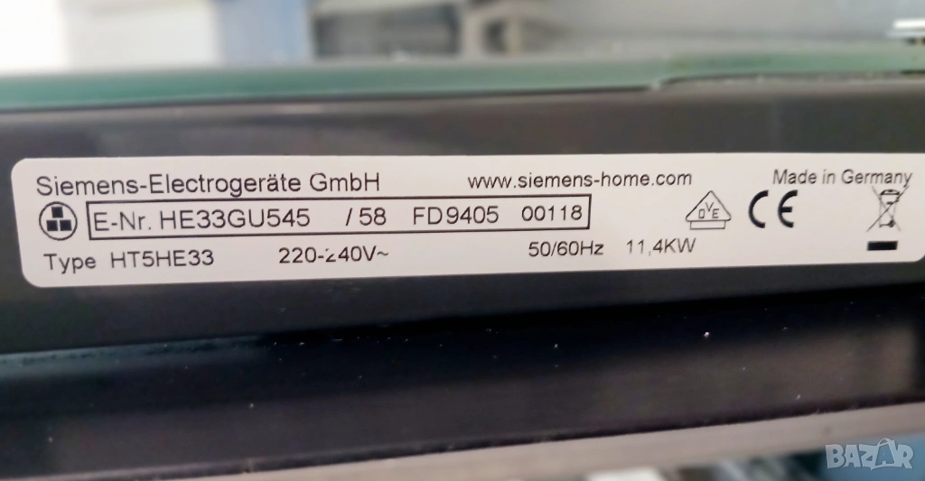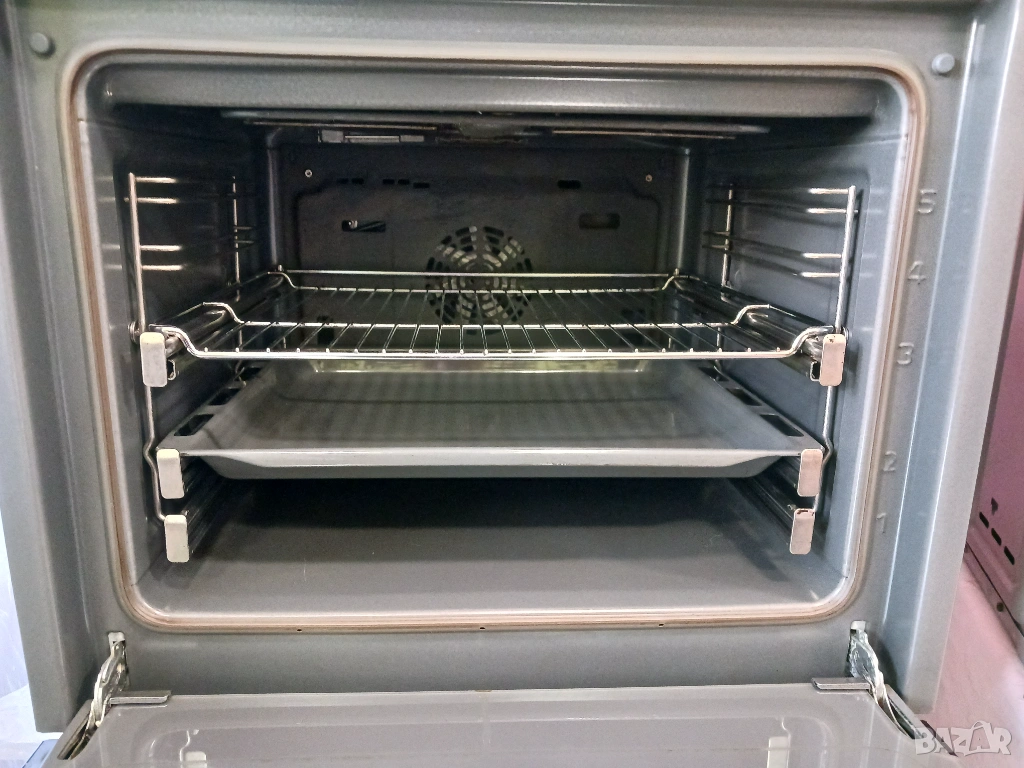 Печка за вграждане SIEMENS, произведена в Германия / цвят - инокс / с пуш бутони и LCD дисплей с часовник, таймер, заключване и др./ Фурната е с вратичка тип студено стъкло, с телескопични водачи и каталитично почистване на задния панел. Има 9 функции (грил, вентилатор, конвекция, размразяване и др.) / котлоните са с 9 степени / плота е с 4 котлона, 2 разширения (сензорни), индикатори за остатъчна топлина и метален кант.