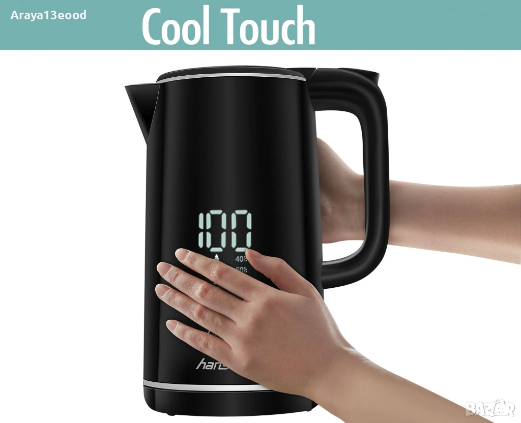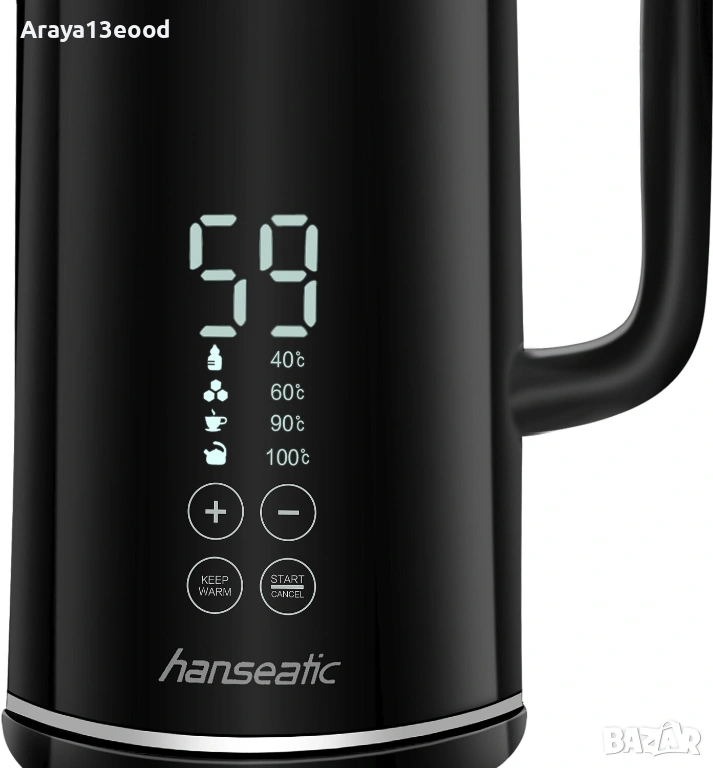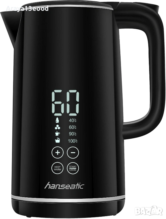 Открий мощната електрическа кана Hanseatic в елегантен черен цвят, която впечатлява с изключително голям дисплей и показване на текущата температура. С капацитет от 1,7 литра и мощност 2200 W, тази кана е перфектният избор за всички, които ценят ефективността и удобството.