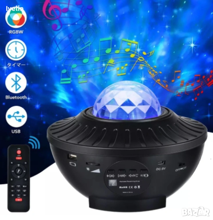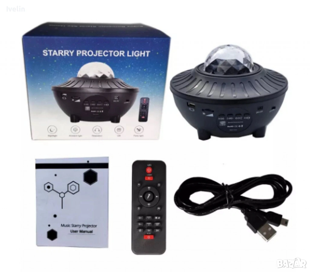 Тип продукт: Нощна светлина с Bluetooth управление и високоговорител; 21 фантастични режима на осветление; Цвят: Черен; Материал: ABS пластмаса, електронни компоненти; Функции: Bluetooth управление, дистанционно управление, високоговорител, 10 цвята, регулируема светлина, 360° ротация; Източник на захранване: Вградена акумулаторна батерия.