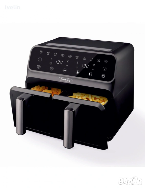 Фритюрник AirFryer Rosberg Premium, 1700W, 2съда x 4л., Горещ въздух, Таймер, до 200°C, Черен 2 ГОДИ