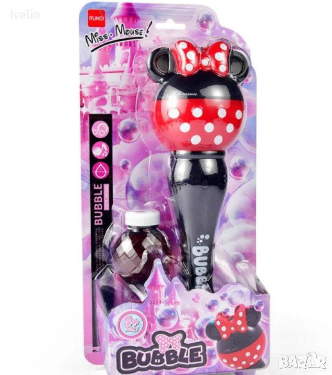 Детска играчка за сапунени балончета със забавен дизайн, вдъхновен от популярния анимационен герой Мини Маус. Създава множество сапунени балончета с едно натискане на бутон, придружени от светлинни ефекти и забавен звук. Идеална за игри на открито и закрито.