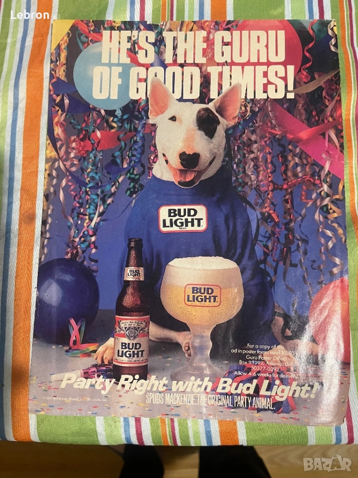 Продавам оригинален ретро плакат с известния талисман на Spuds MacKenzie от реклама на Bud Light. Плакатът е с парти дизайн и надпис “He’s the Guru of Good Times!”.