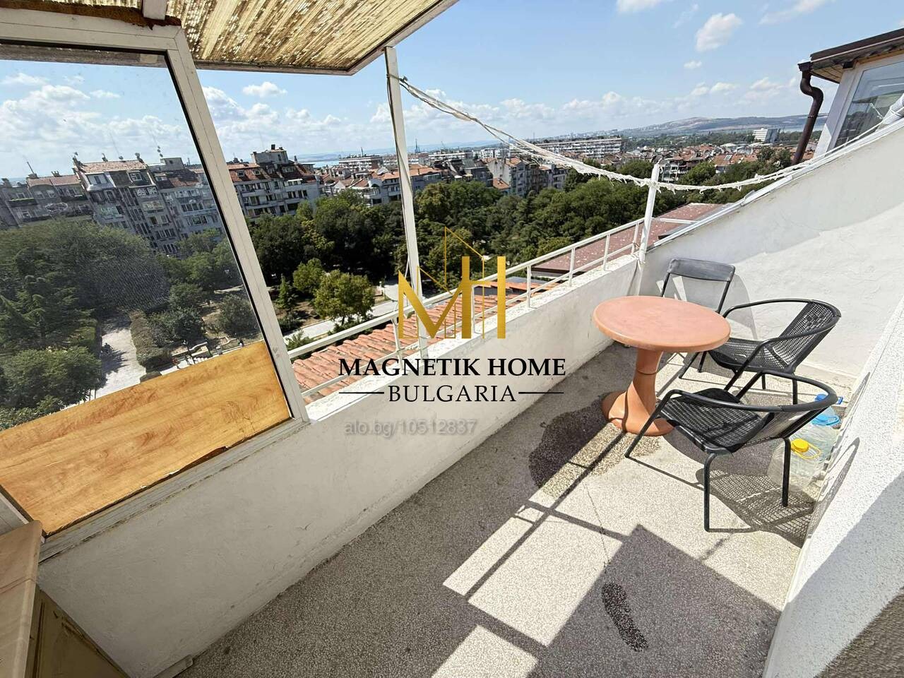 Разпределението на имота се разгръща както следва: входно антре, баня + тоалетна, общо холно / спално помещение, отделен кухненски бокс и голяма полу-закрита тераса.