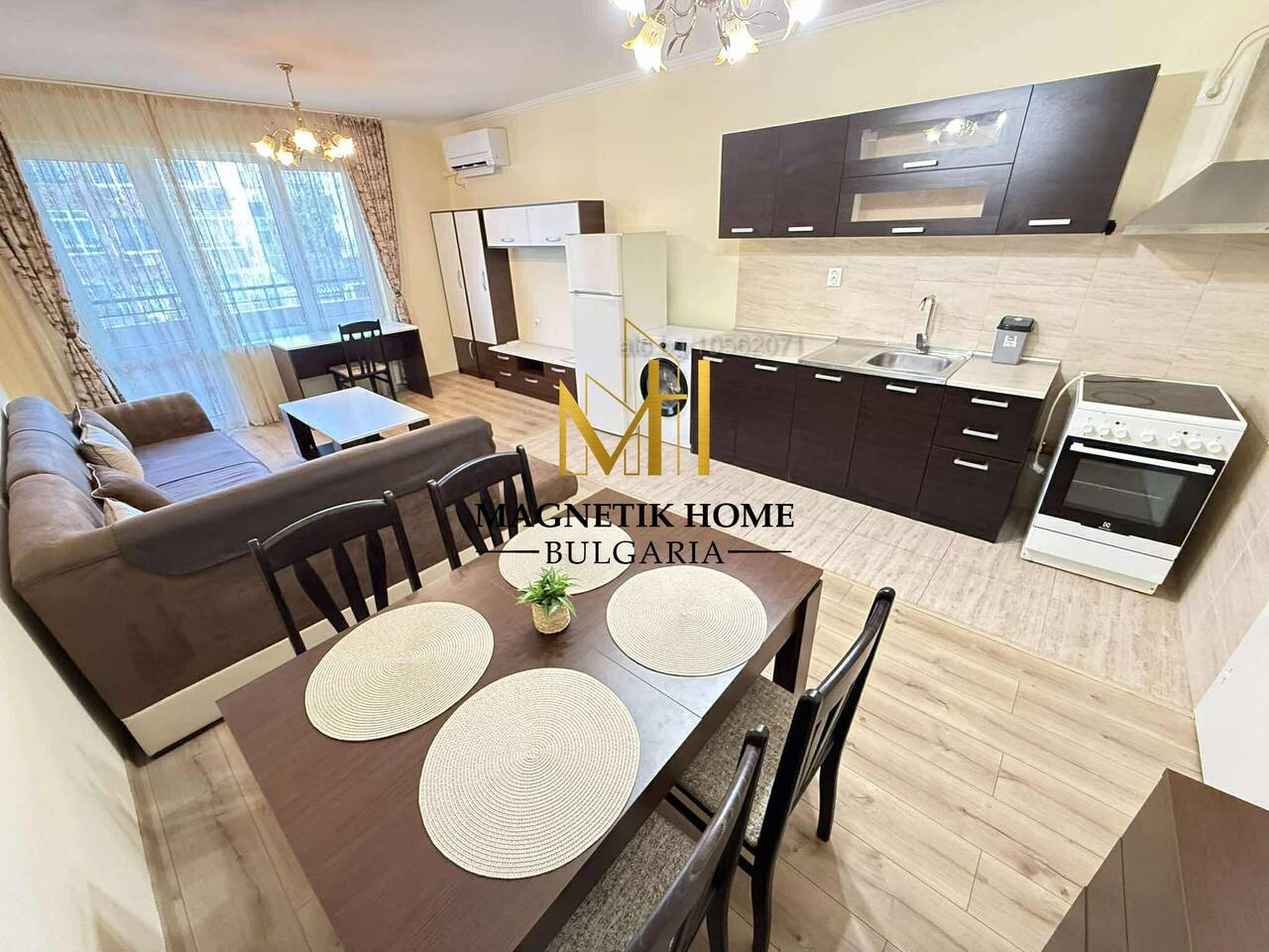 Апартаментът е оборудван изцяло до най - малкият детайл като в допълнение се предлагат 2 инвенторени климатика , СМАРТ Mitshubishi , смарт телевизор, микровълнова, високо - качествени електроуреди, кафемашина, прахосмукачка, ютия, цялостна кухненска посуда, спално бельо и т.н.