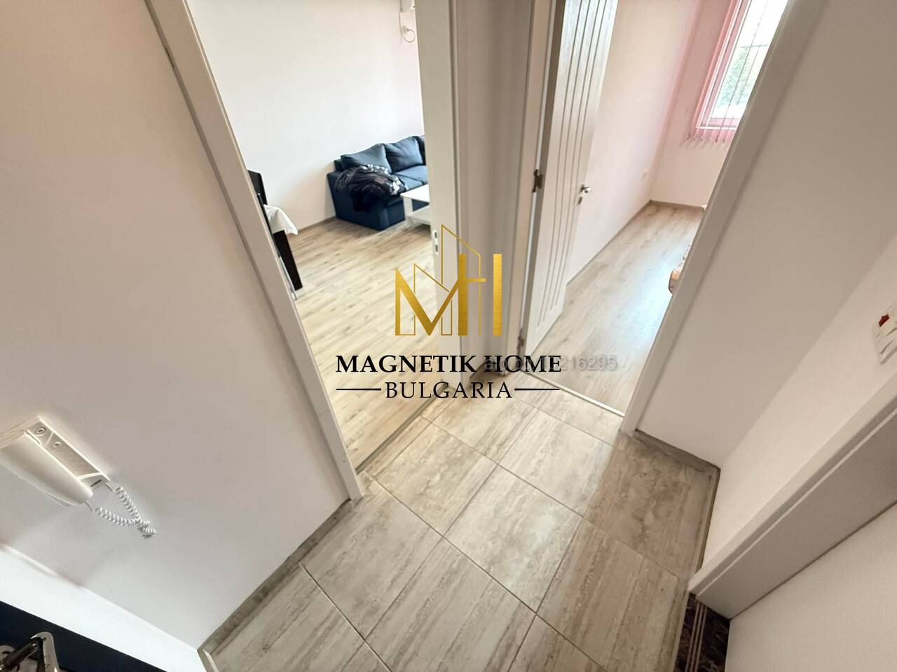Разпределението на имота се разгръща както следва: входно антре, баня и тоалетна, просторен хол с голям Г