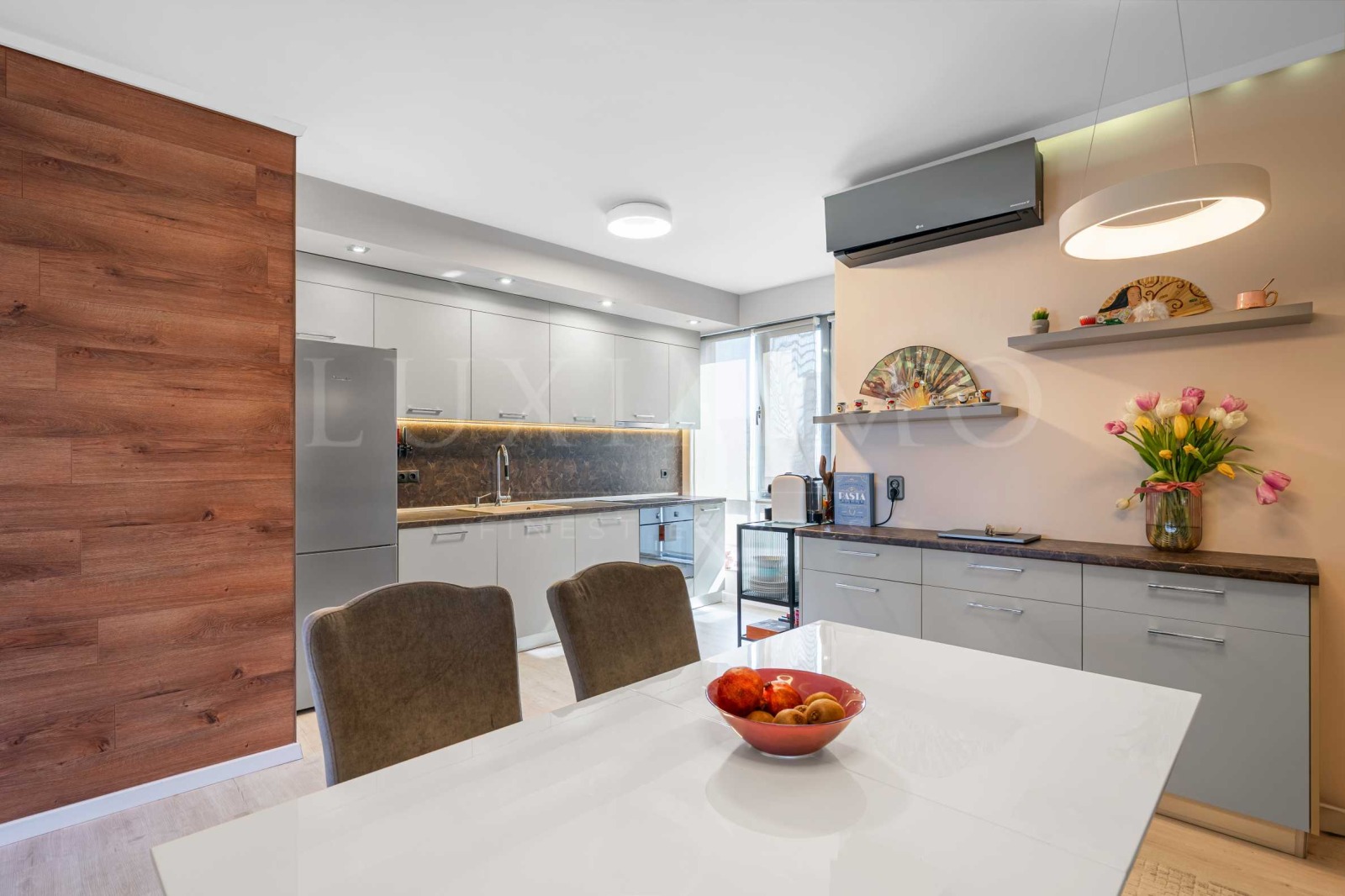 Голяма дневна с кухня и трапезария, организирана в едно общо пространство с логичен ритъм и движение.