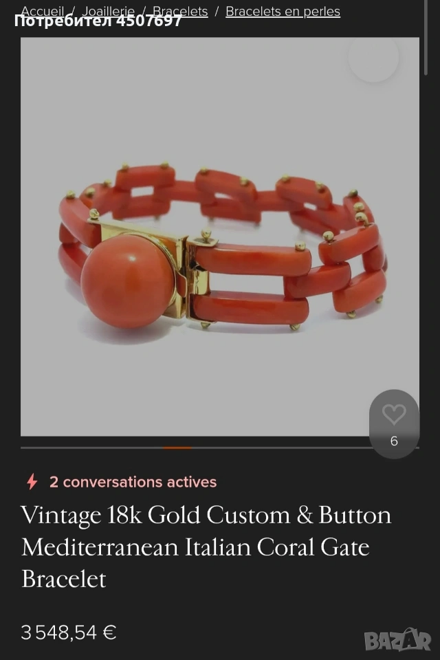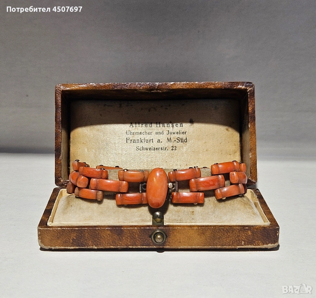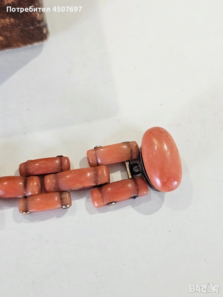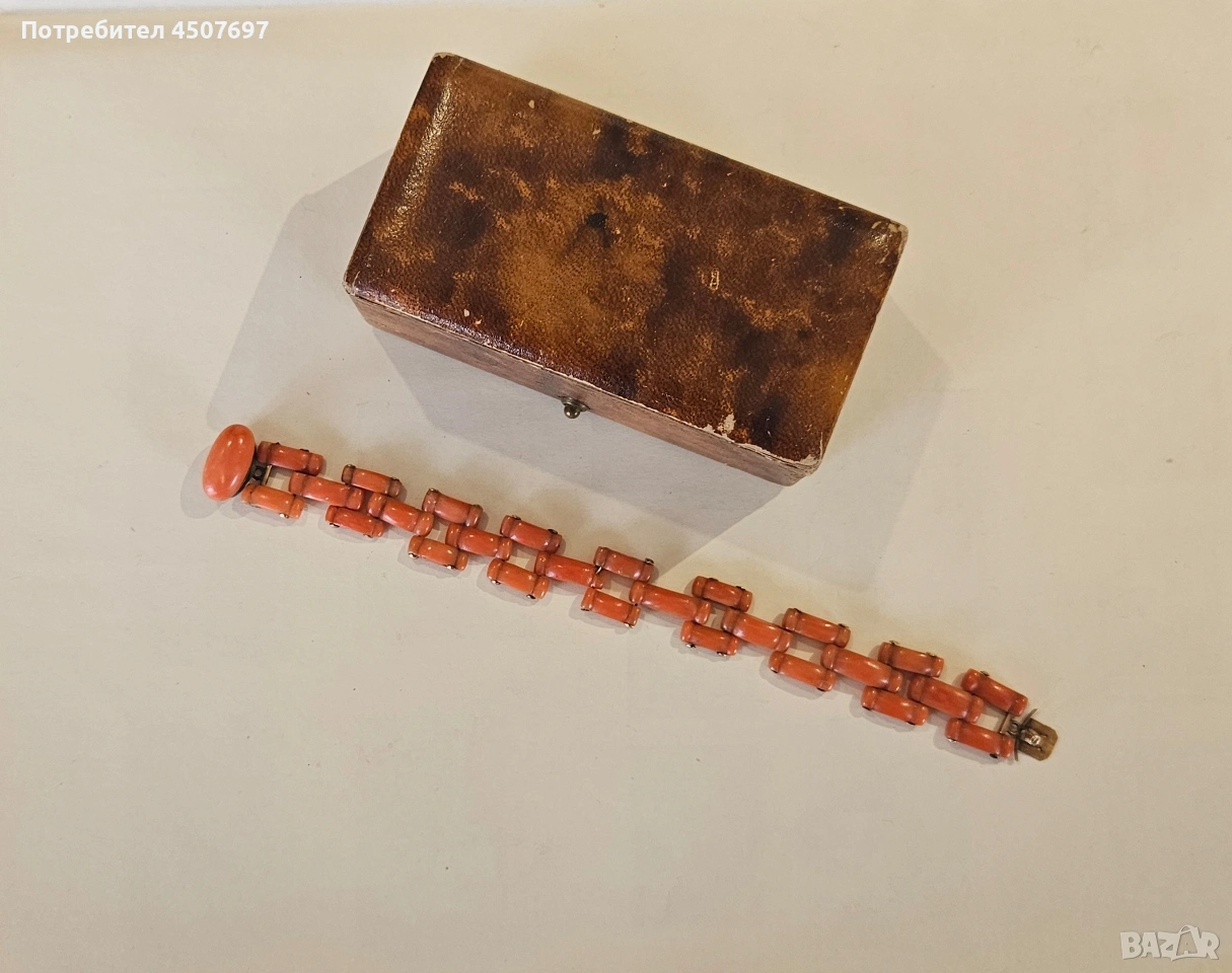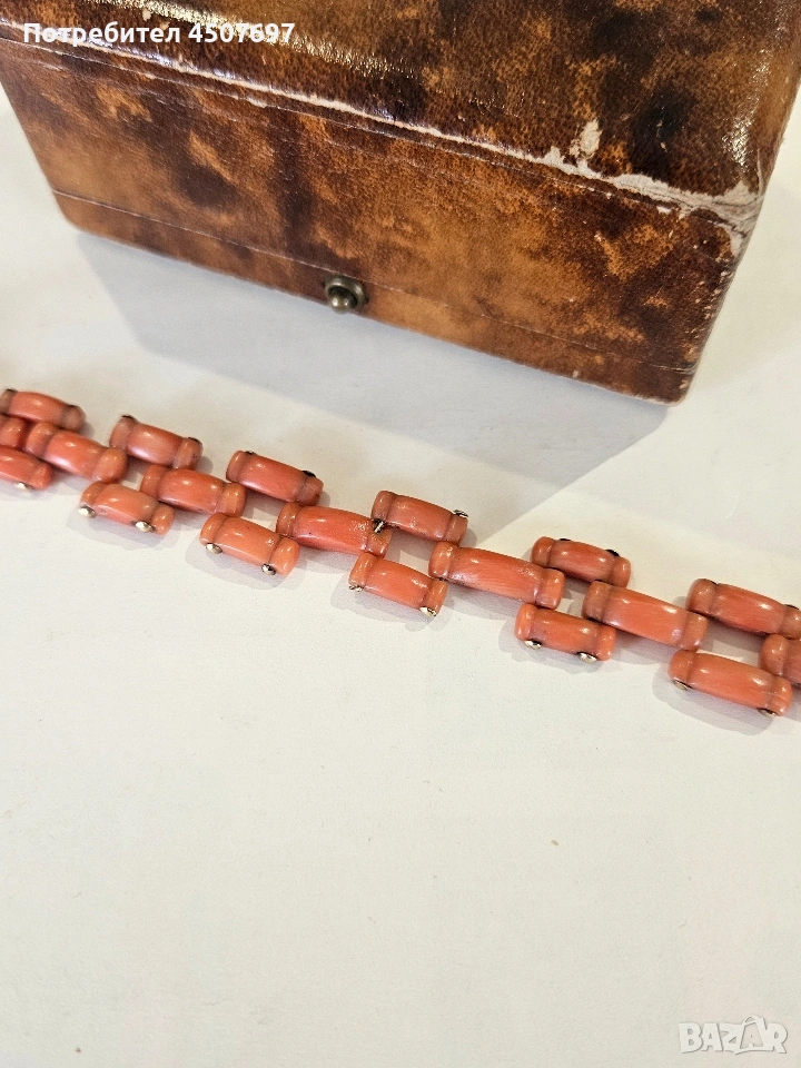 гривната е антикварно бижу, изработено от оранжев горал често наричан цвят сьомга, характерно за викторианската епоха или периода на Арт Деко. 14к злато. няма маркировка гривната е проверана при специалист.