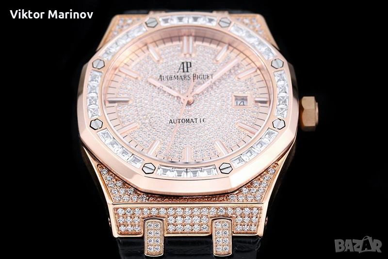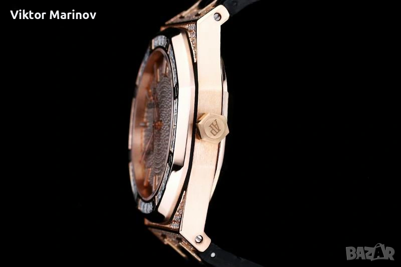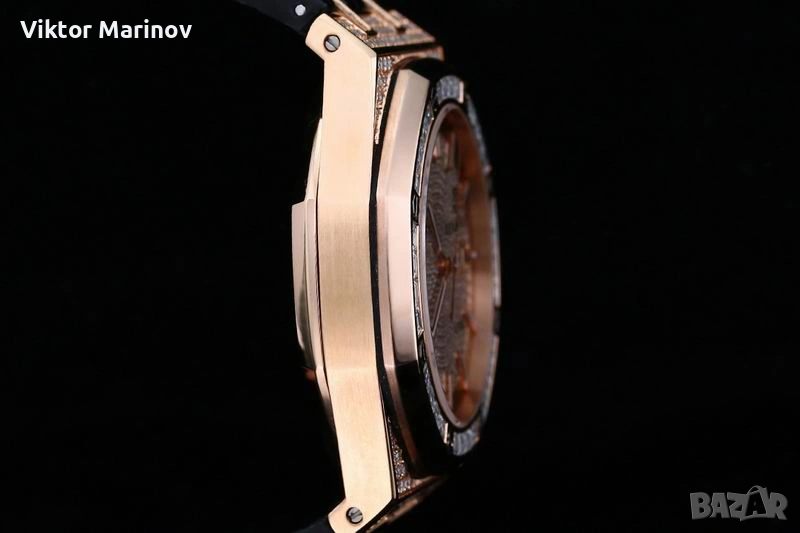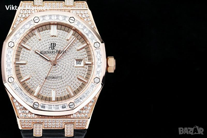 Часовникът е с автоматичен механизъм и характерния дизайн на Royal Oak. Касата е богато инкрустирана с камъни, а безелът е със стилни baguette камъни, които придават изискан и премиум вид. Циферблатът също е инкрустиран и завършен с розово-златисти индекси и стрелки, плюс дата на 3 часа.