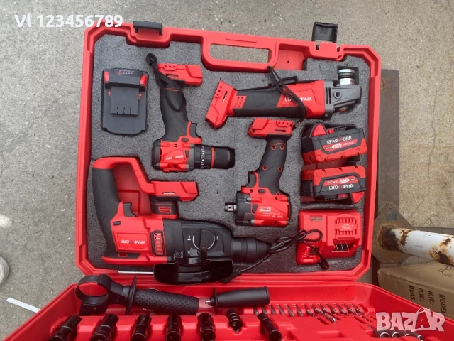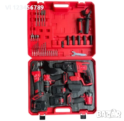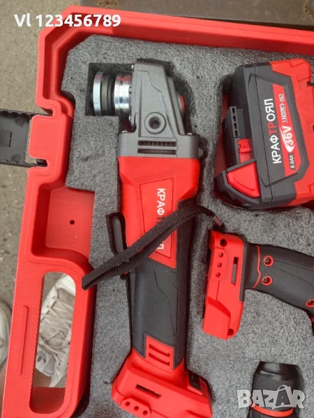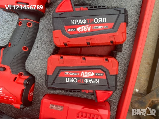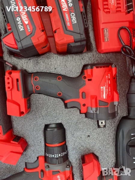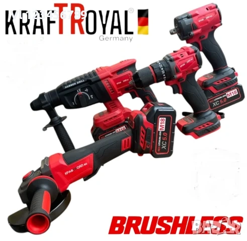 Акумулаторен Комплект Инструменти 4в1 Комбиниран Безчетков Ударен Гайковерт/Импакт + Безчетков Ъглошлайф 125мм + Ударен Безчетков Перфоратор + Ударен Безчетков Винтоверт 36V 8,0AH с 3 броя батерия KRAFT ROYAL
