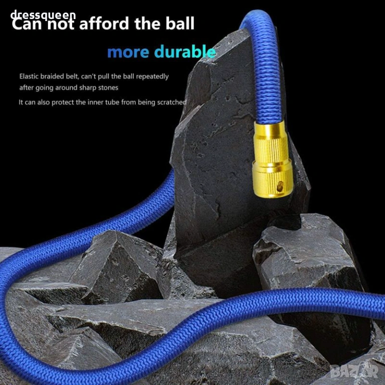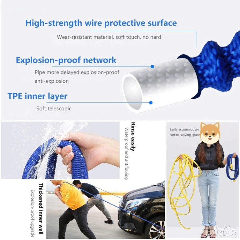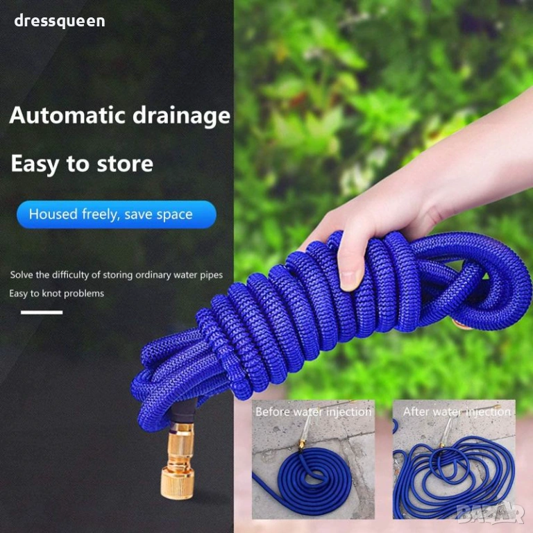 Не ти трябва огромен маркуч? Този лек и разтегателен маркуч до 7.5 м е точно за теб! С тегло само 0.4 кг, той е лесен за носене, прибиране и съхранение. Разтяга се до три пъти дължината си при включване на вода и се свива обратно след употреба.