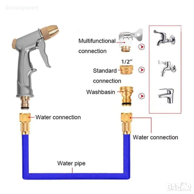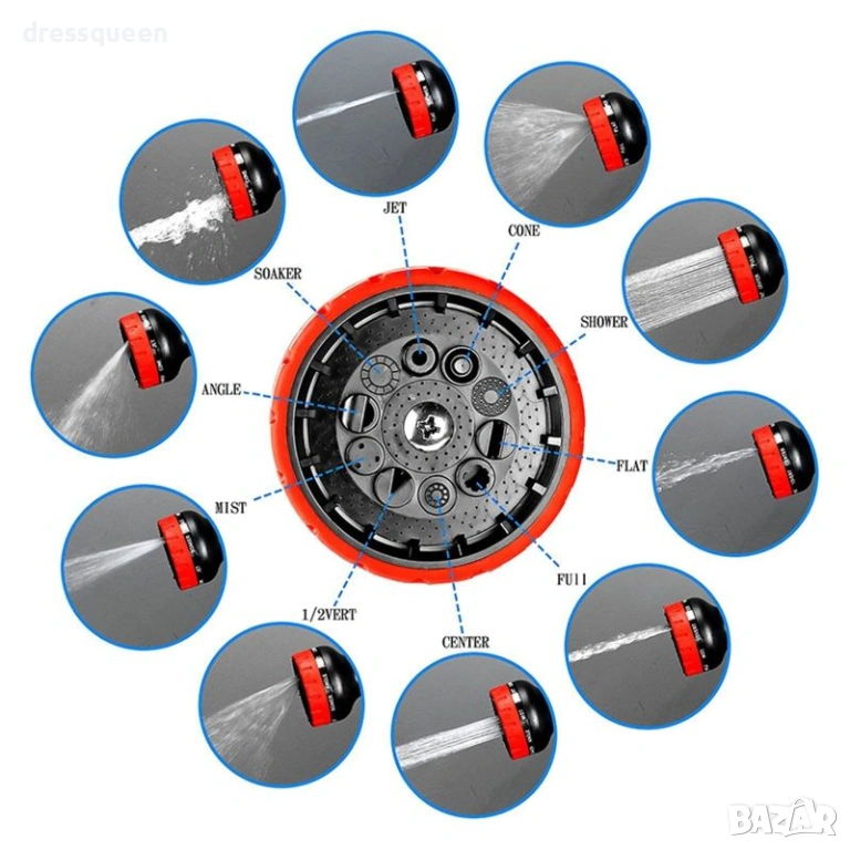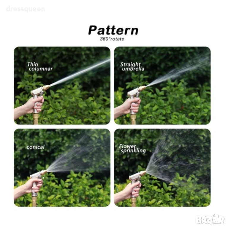 Металният пистолет включен в комплекта е удобен и ефективен – идеален както за деликатно поливане на цветя, така и за силно пръскане при миене. Лесен за съхранение, лек и изключително практичен.