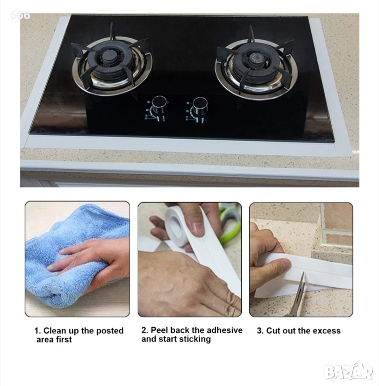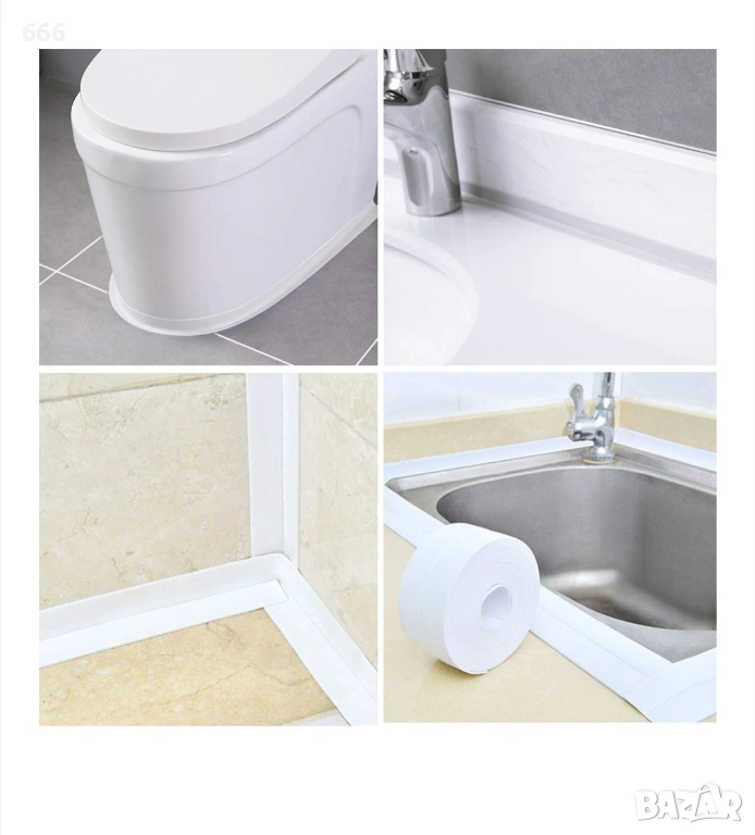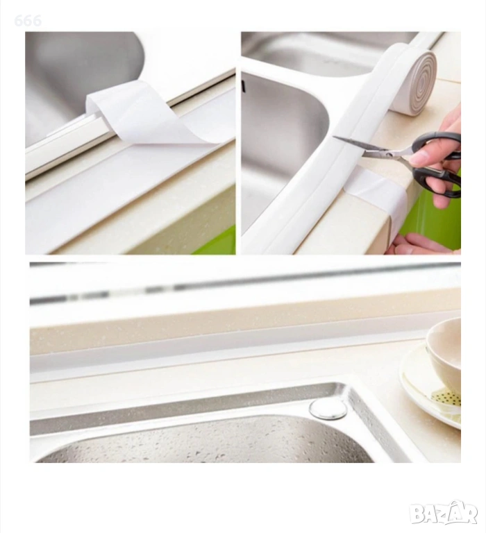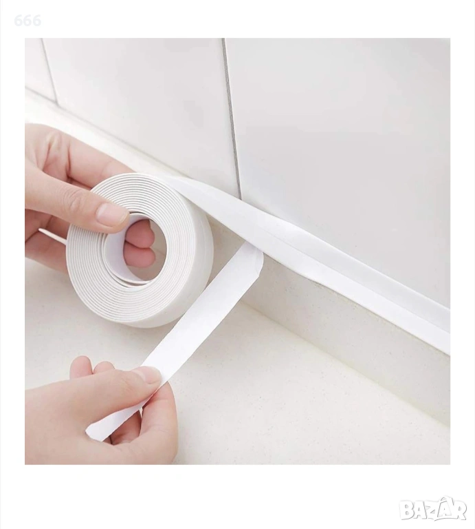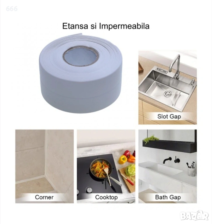 Уплътнителна лента със залепващо лепило, която може да се използва за уплътняване на местата на проникване, свързване на санитарни и кухненски системи, кухненски плотове, котлони, вани, душ кабини, тоалетни чинии и др.