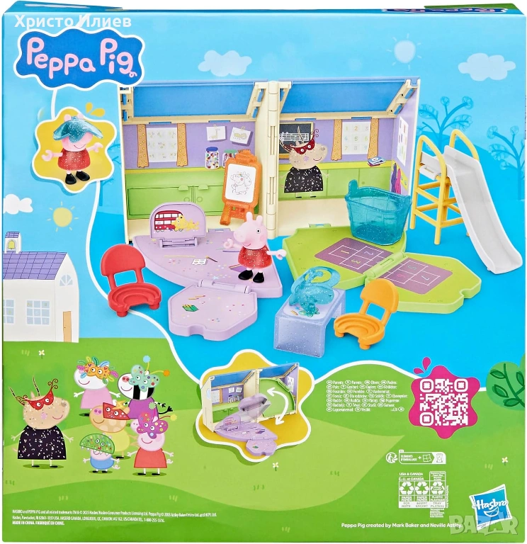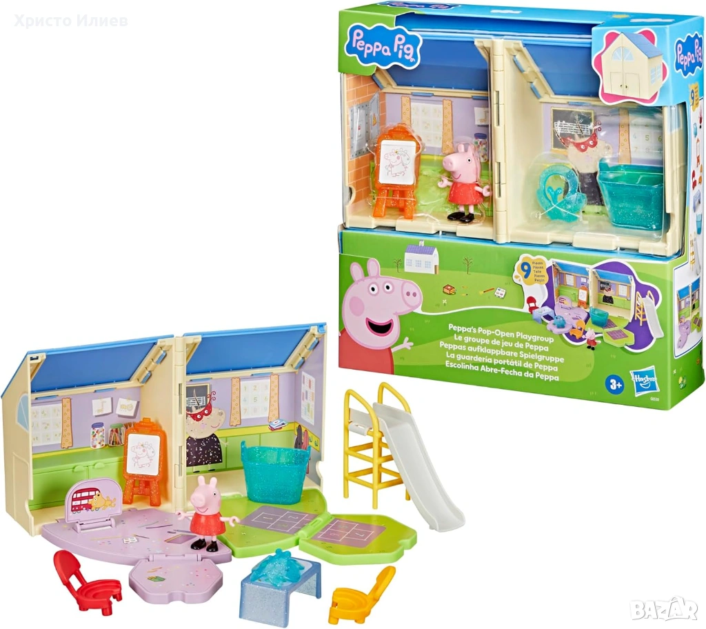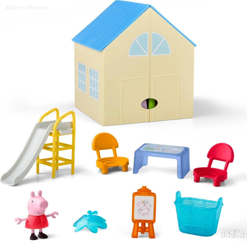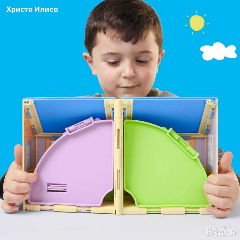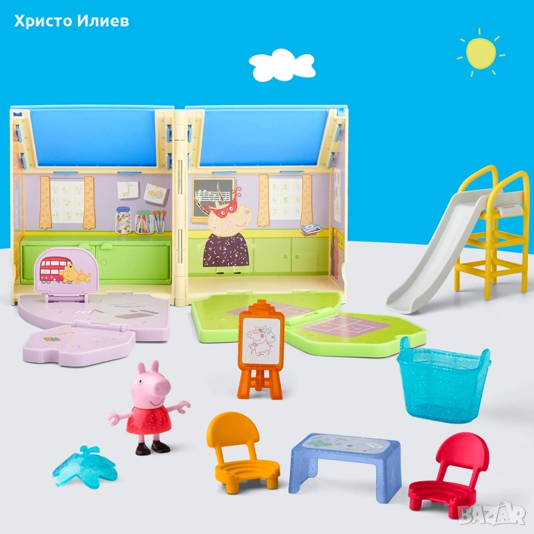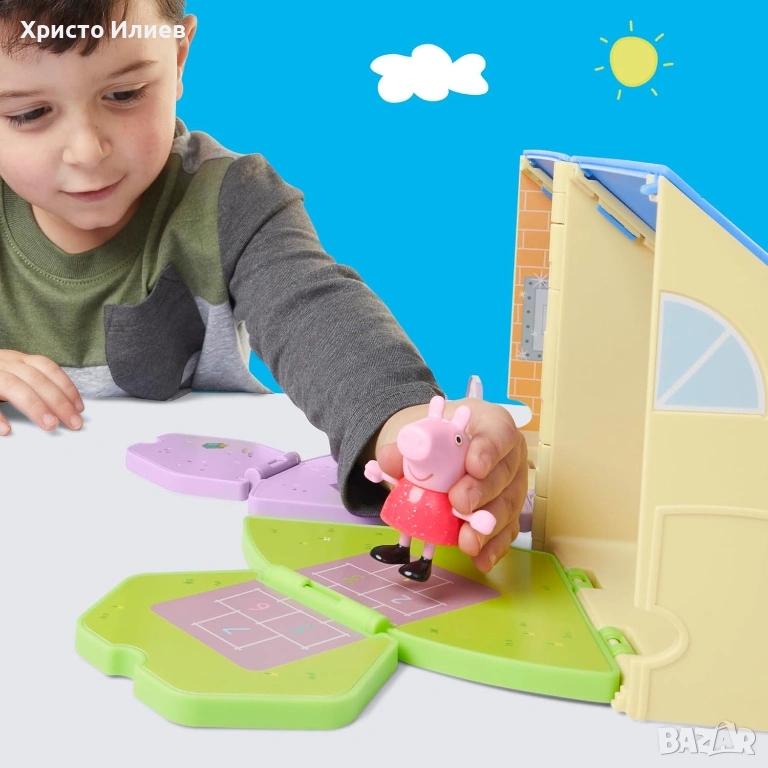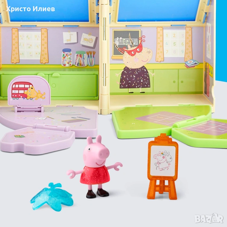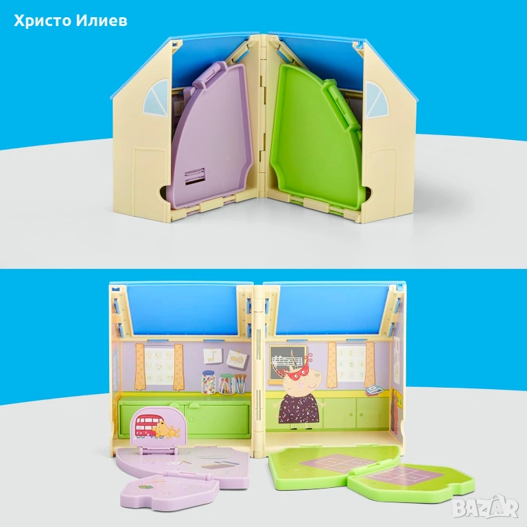 Комплект за игра с класна стая и площадка за игра: сгъваемият комплект играчки Peppa Pig предлага две зони за игра в една. Децата могат да отворят къщичката, да подредят класната стая и да се насладят на вълнуваща ролева игра навън в двора с Peppa.