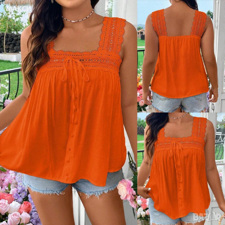 Макси ефирен клоширан потник с прекрасна широка дантела, еластичен подгъв гръб+ декоративна вързалка и декоративни копчета в оранжево