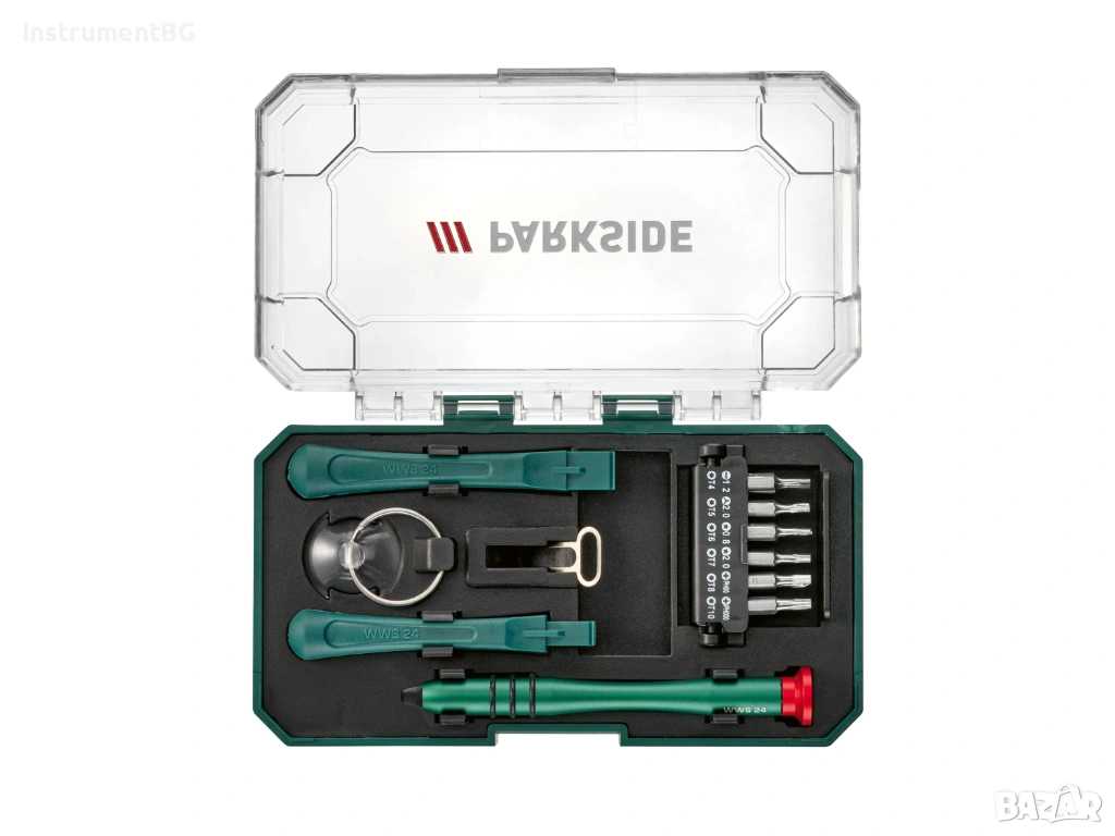 Този комплект се състои от няколко комплекта инструменти в практична кутия за съхранение, комбиниращи тресчотка, прецизни и глухи гаечни ключове, както и комплект за ремонт на смартфони. Инструментите са изработени от стомана с пластмасови детайли и разполагат с ергономични двукомпонентни дръжки, магнитно удължение и адаптер за битове. Комплектът включва множество битове с различни дължини и профили (включително TX, PH, SL, PZ, шестостенни, трикрили и звездообразни), вложки с обичайни размери и дръжка тип нож с множество прецизни остриета. Тресчотката включва лост за обръщане на посоката на часовниковата стрелка и обратно на часовниковата стрелка, както и мини инструменти за ремонт на мобилни телефони, всички спретнато организирани в компактна кутия.