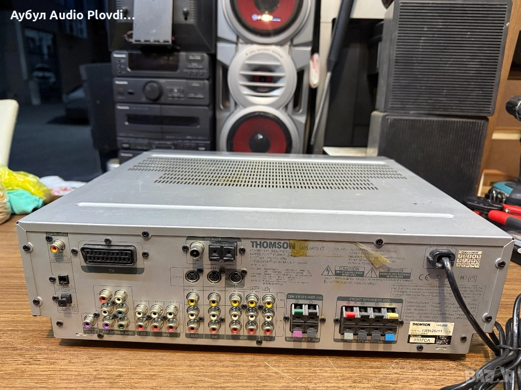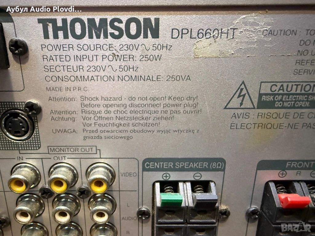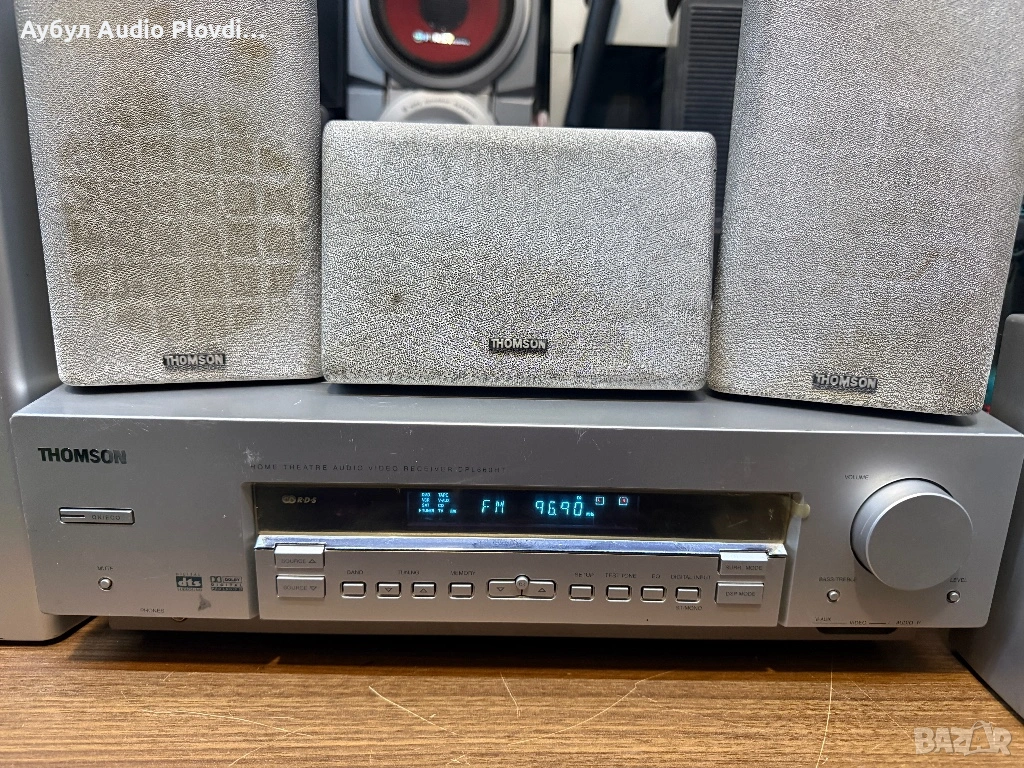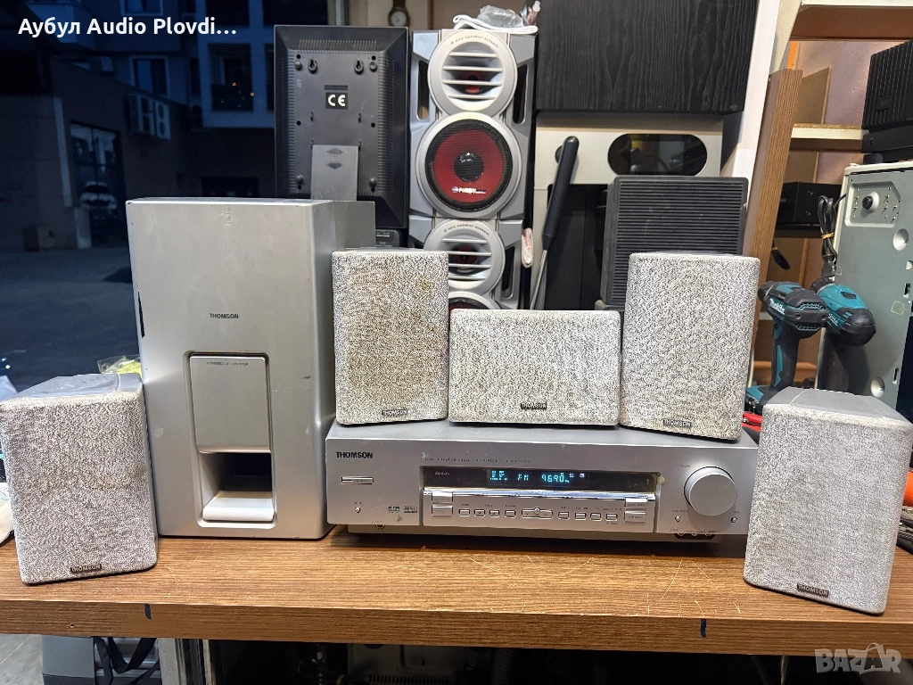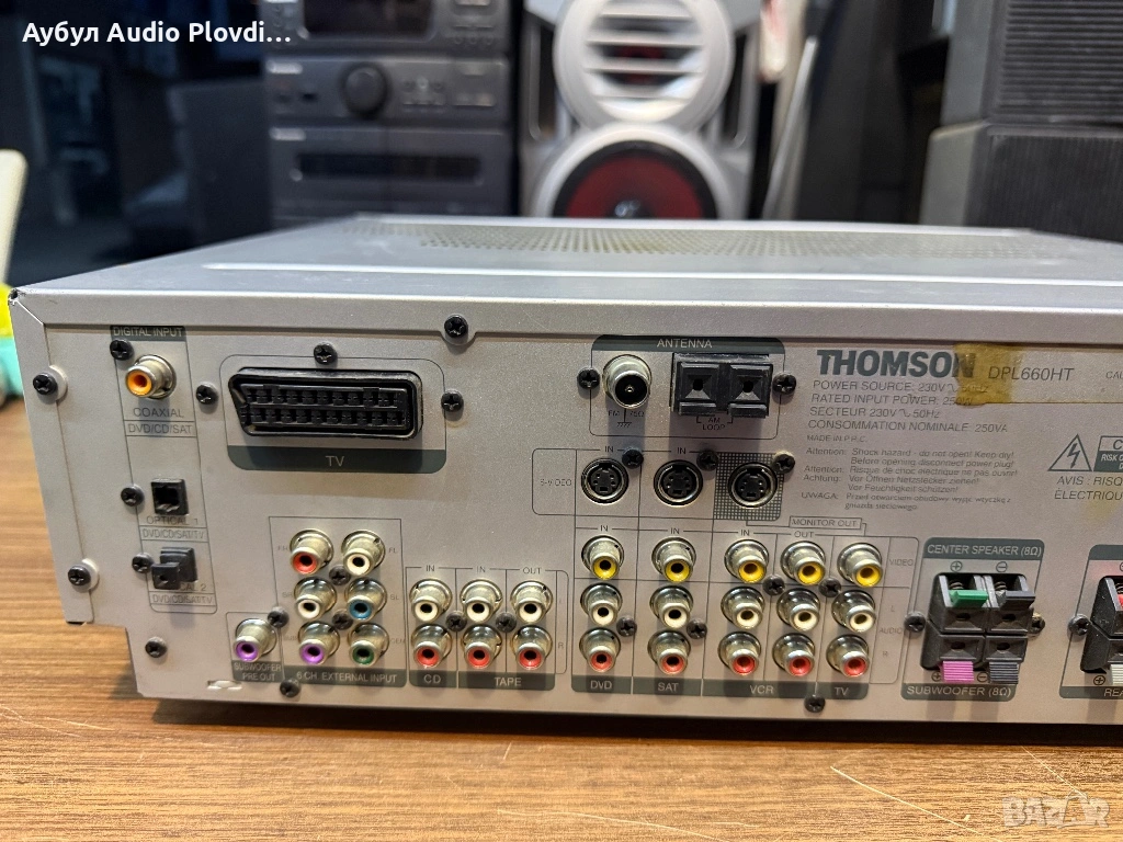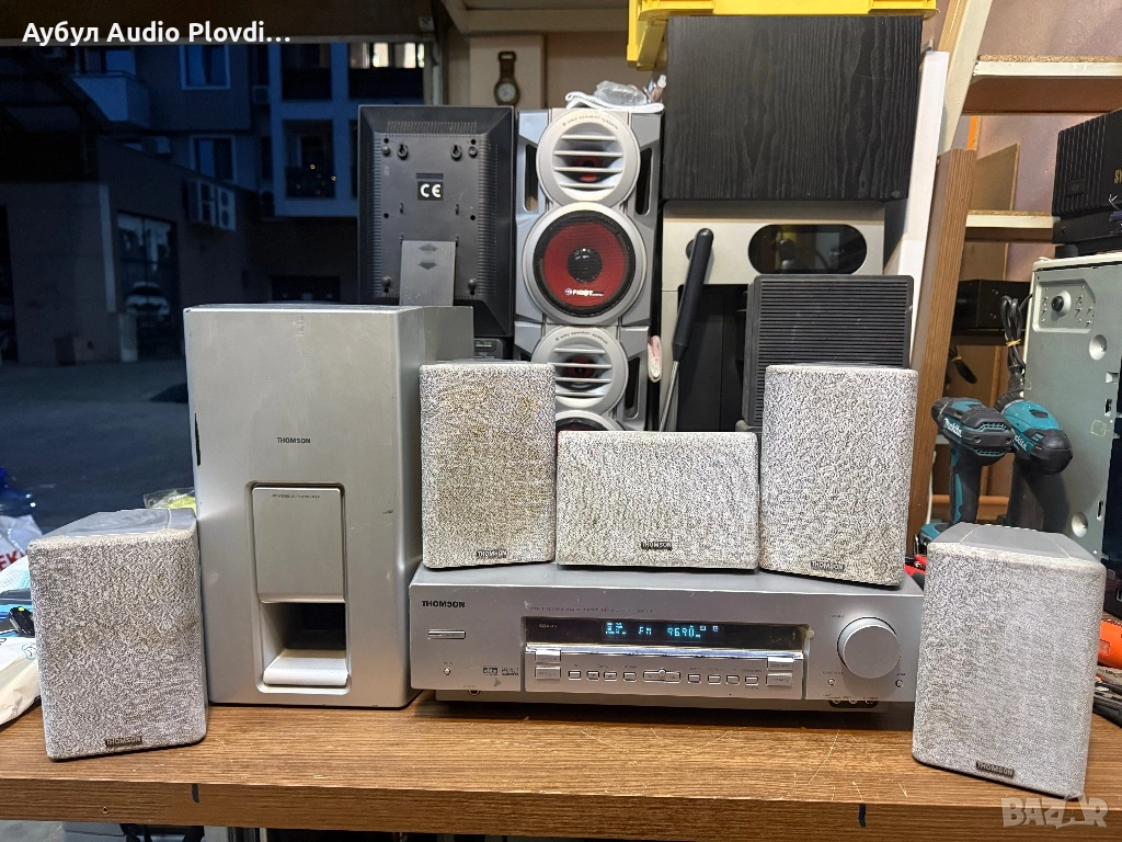 Thomson dpl660ht sound system с 6 канала за тонколони в работещо състояние.Thomson dpl660ht спецификации на оборудването: СЕКЦИЯ НА УСИЛВАТЕЛЯ: Всичките 5 канала: всеки по 100 W при 8 ома. <0.9% THD @40Hz до 20KHz Канал на субуфера: 150w при 8Ω, < @100 Hz Затихване на звука: 65dB Честотен обхват: 40Hz до 20kHz +/-3dB Съотношение сигнал/шум: 65dB (режим Dolby digital)с оригинални Дистанционно Работи Перфектно Цената в евро