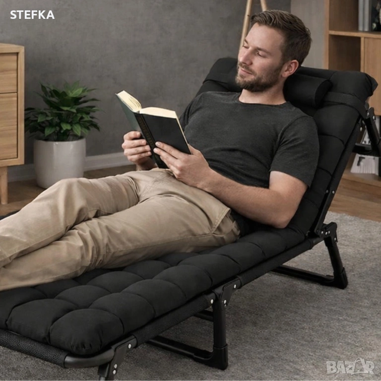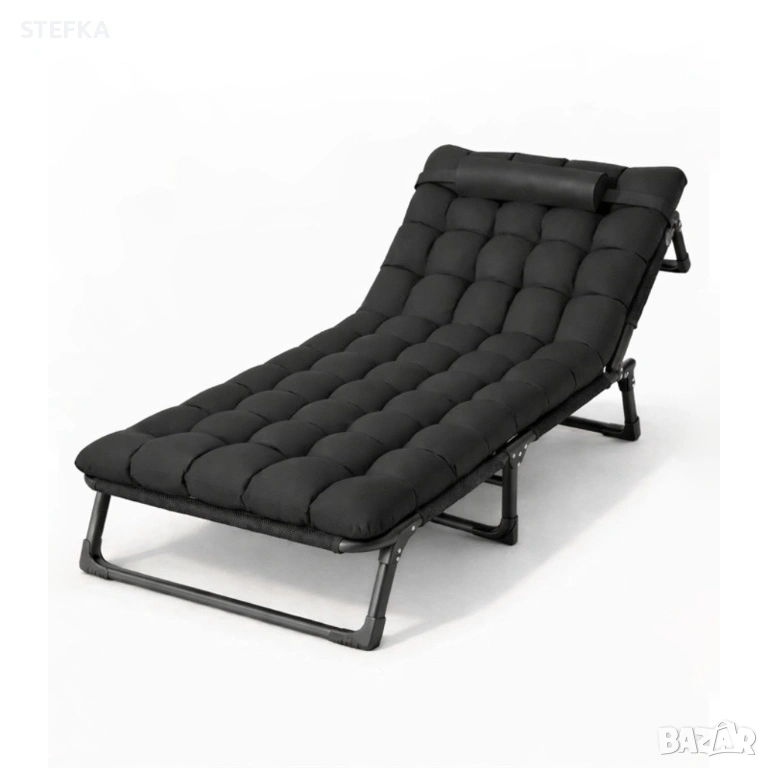 Сгъваемо къмпинг легло и градински шезлонг 2в1, с мек матрак и възглавница, Регулируем, Черен, 180x56 см