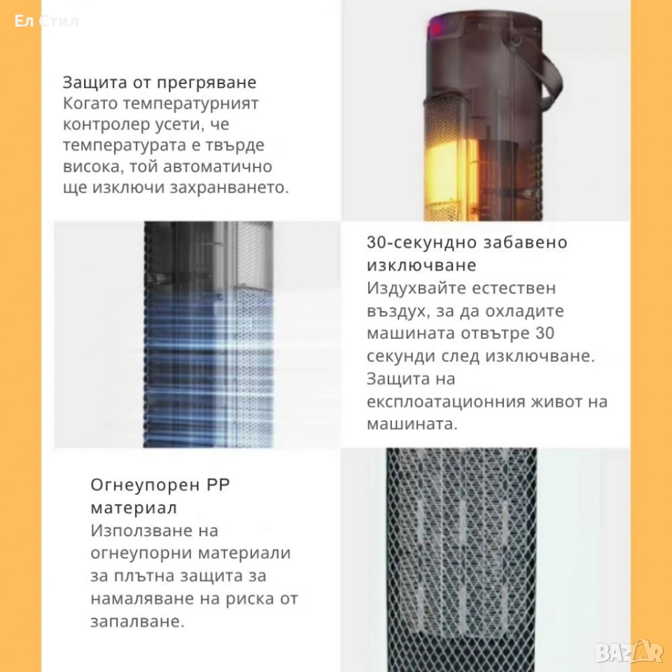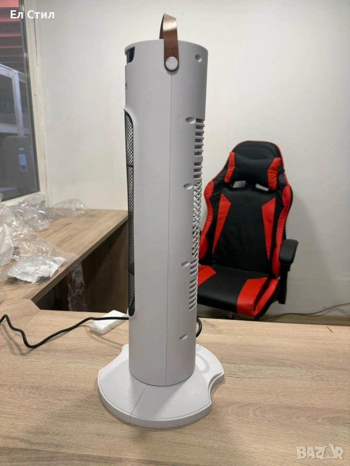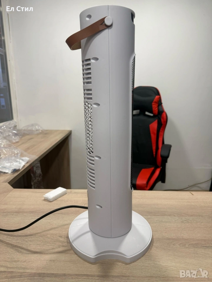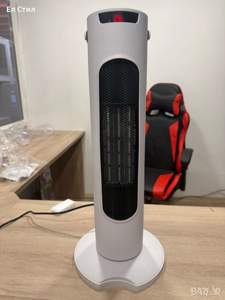 Мощност: 1500 W; Напрежение: 220–240 V | Честота: 50 Hz; Отоплителна технология: PTC керамичен елемент; Режими: отопление и вентилатор (без нагряване); Скорости на вентилатора: 3 (ниска/средна/висока); Степени на отопление: 2 (Low/High); Осцилация: ~60°; Управление: тъч панел + дистанционно | Функции: таймер, осцилация; Размери: 57.99 x 16.99 x 15.98 cm Дисплей: LED цифров; Безопасност: защита от прегряване; 30 сек. отложено изключване; огнеустойчив PP корпус; Тегло: ~2 кг | Тип корпус: тънък tower дизайн с дръжка; Гаранция: 12 месеца.