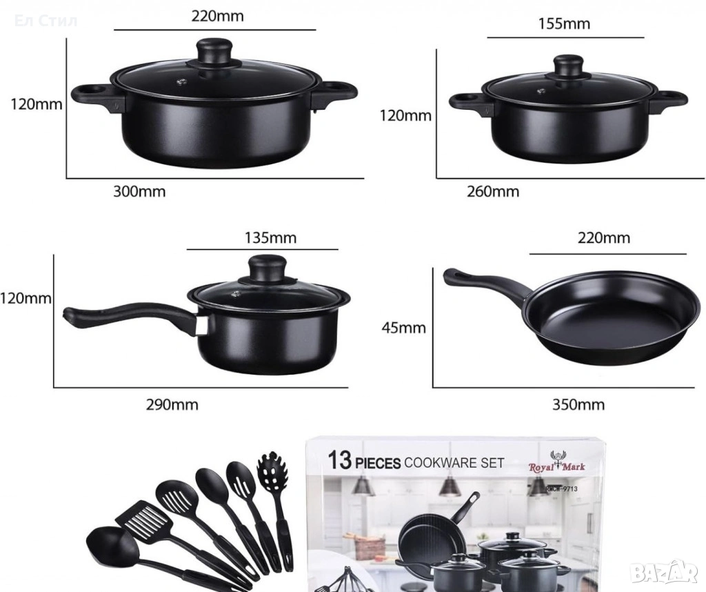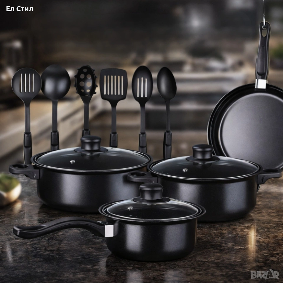Комплектът включва 2 тенджери, 1 касерола, 1 тиган, 3 стъклени капака + комплект от 6 части за готвене;